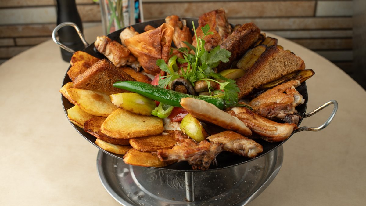 Toyuq filesi,quzu əti, bolqar bibəri, pomidor, badımcan, göbələk, soğan, kartof