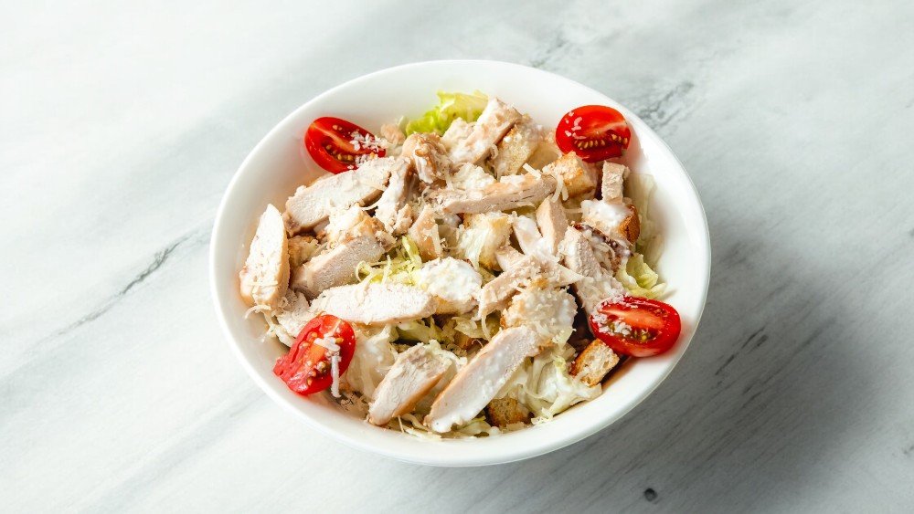 Toyuq filesi, aysberq kahısı, sous, çerri pomidoru, suxari