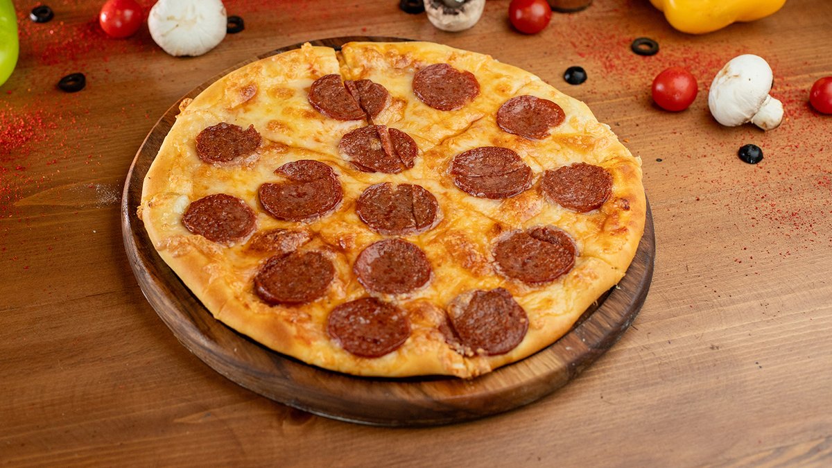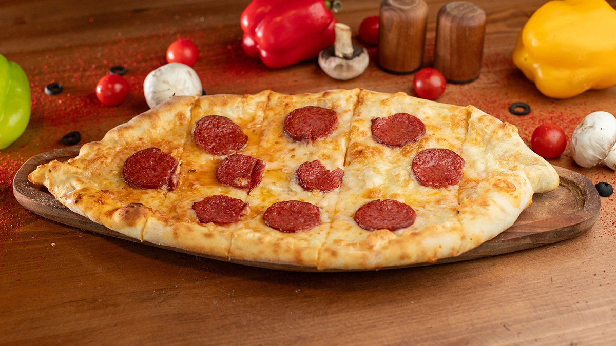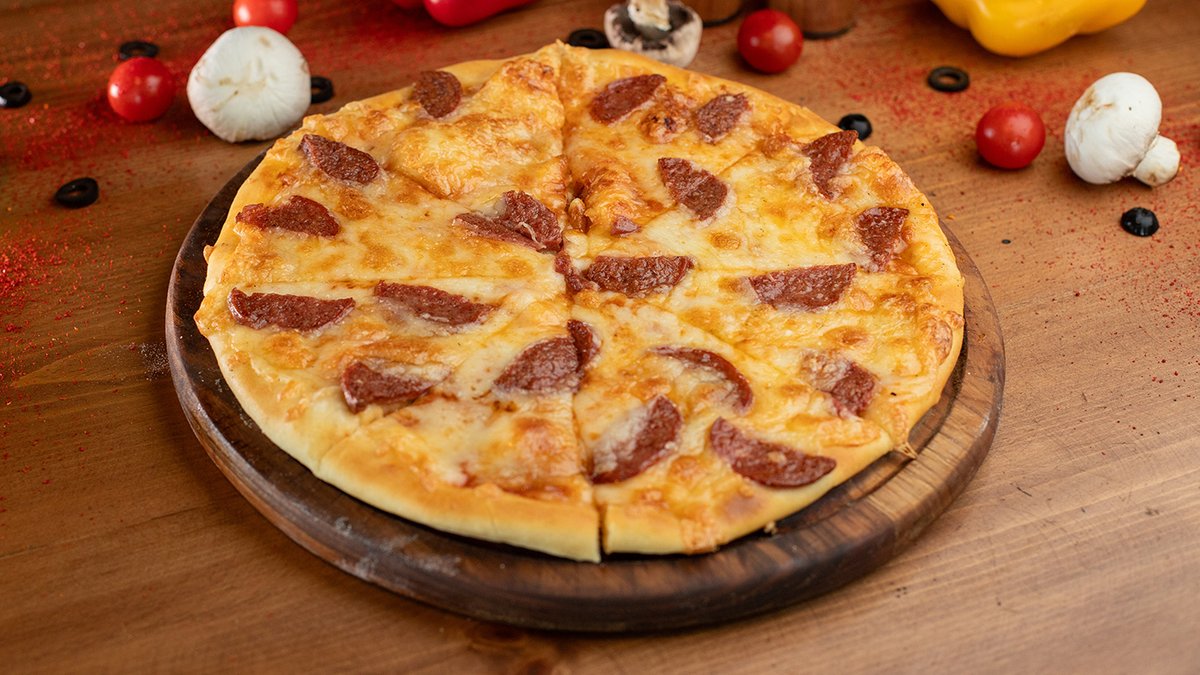 Kolbasa (halal), mozzarella pendiri, pizza sousu