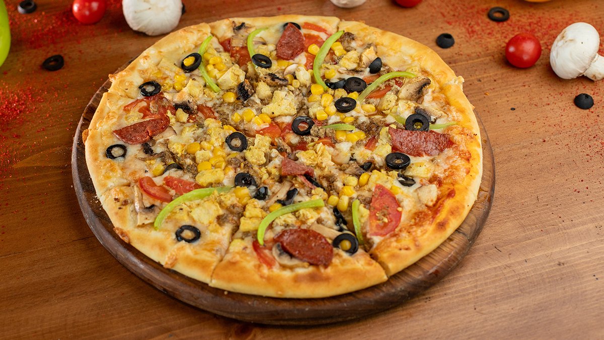 Pomidor, şirin bibər, qarğıdalı, zeytun, mozzarella pendiri, pizza sousu