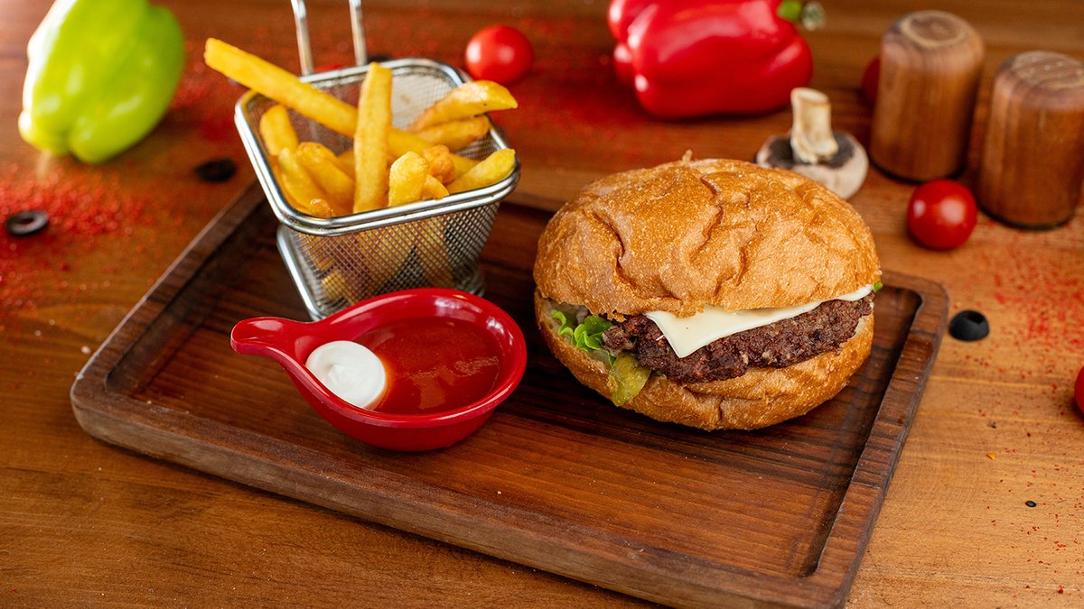 Sous, soğan, pomidor, sumaq, göyərti, mal əti, kartof fri