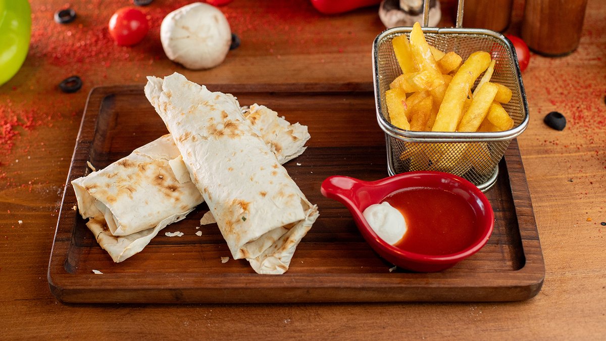 Toyuq filesi, turşu xiyar, pomidor, şaurma sousu, kartof fri