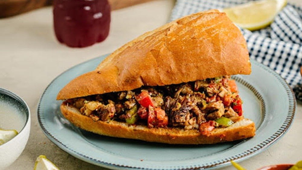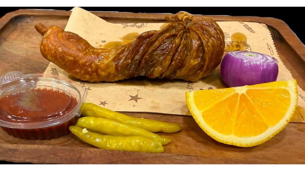 3 dilim üzüklü kokoreç, turşu, ədviyyat və dilimlənmiş çörək ilə