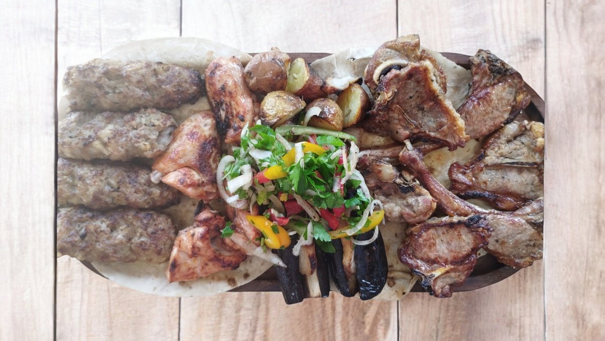 Tikə kabab (quzu), basdırma (dana can əti), lülə kabab (dana əti), toyuq lüləsi, toyuq kababı (2 əd), pomidor (2 əd), badımcan quyruqla (2 əd), acı bibər