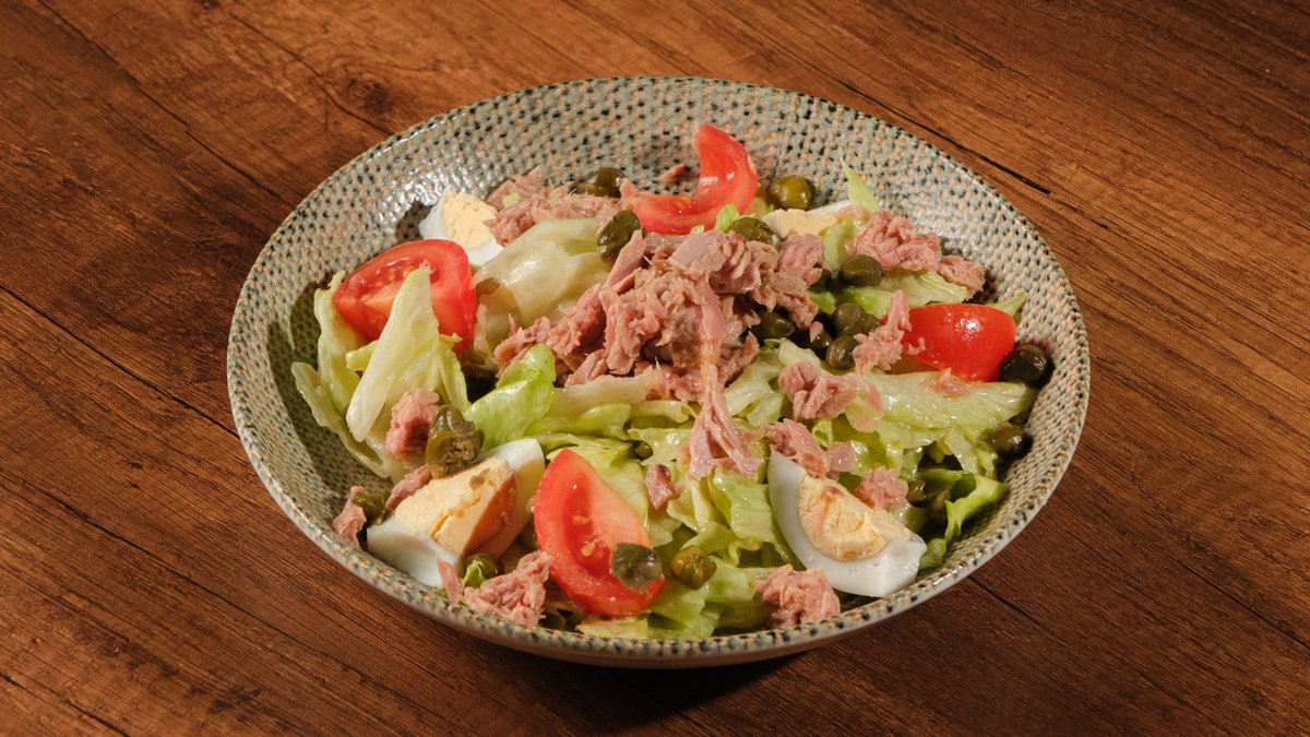 İceberg, rukola, Ton Balığı, balığı, pomidor, yumurta, kapers, limonlu, xardal sousu,
