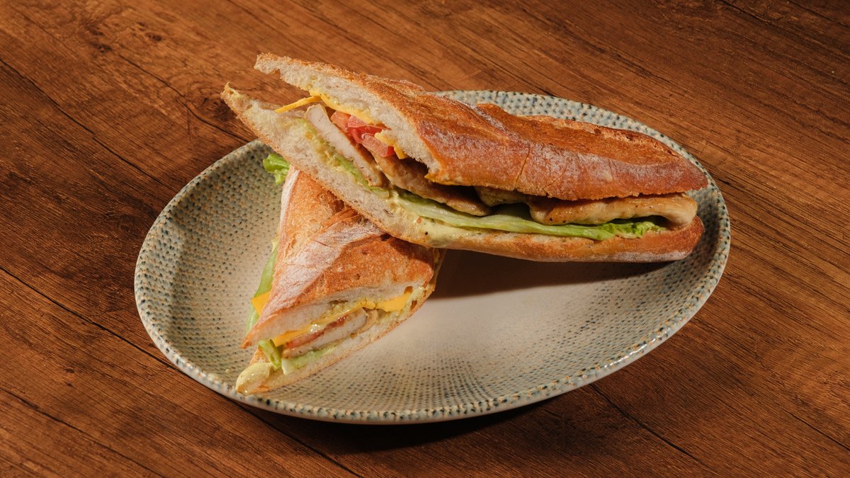 Fransız çörəyi, toyuq əti, iceberg, pomidor, duzlu, xiyar, cedar, pendiri, karri, moya sousu,