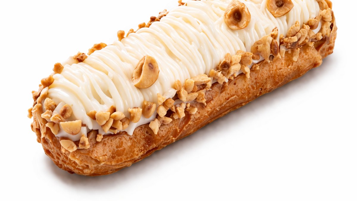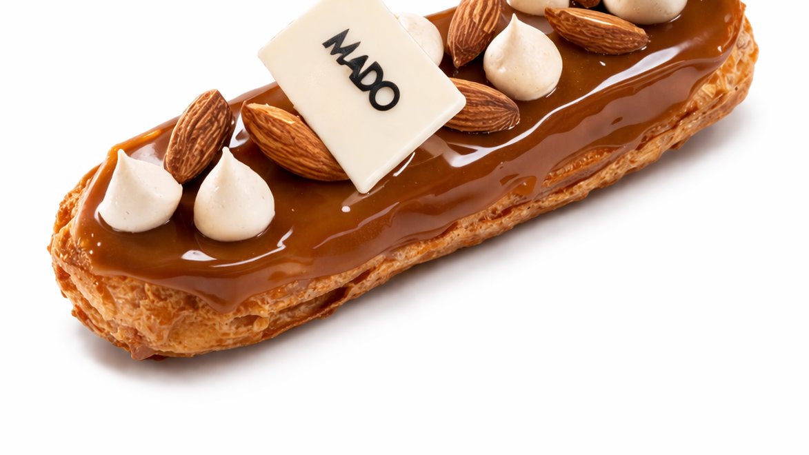 Ekler xəmiri, qaymaqlı bişmiş krem, fındıq pralini, karamel, qovrulmuş badam.