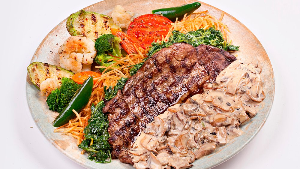 Ət köftə (dana əti, quzu quyruğu), kartof, qırmızı lobya, çerri pomidor, badımcan kürüsü (badımcan, bibər, soğan, pomidor), qızardılmış çörək, göyərti, xüsusi sous.