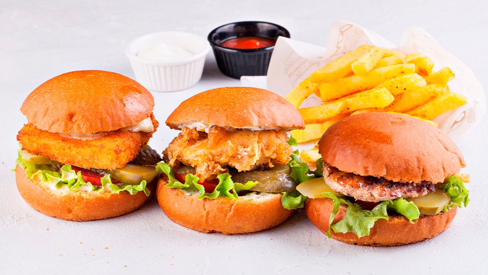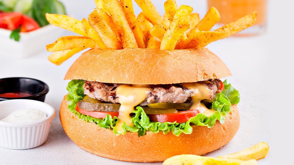 Dana əti, quzu quyruğu, duzlu xiyar, pomidor, pizza xəmiri, çeddar pendiri, kartof fri, ketçup, mayonez.