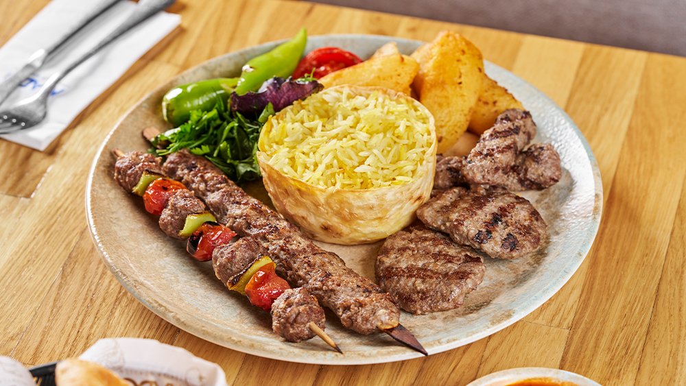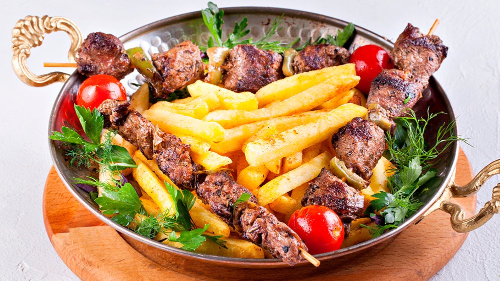 Dana əti, quzu quyruğu, qarnir seçim ilə: düyü və ya kartof fri, pomidor, duzlu xiyar, ketçup, mayonez.