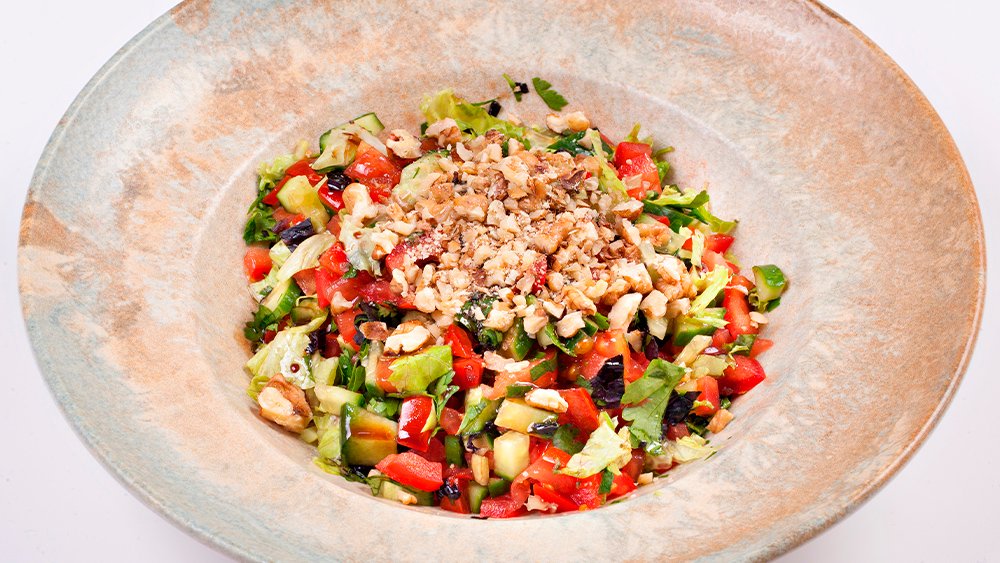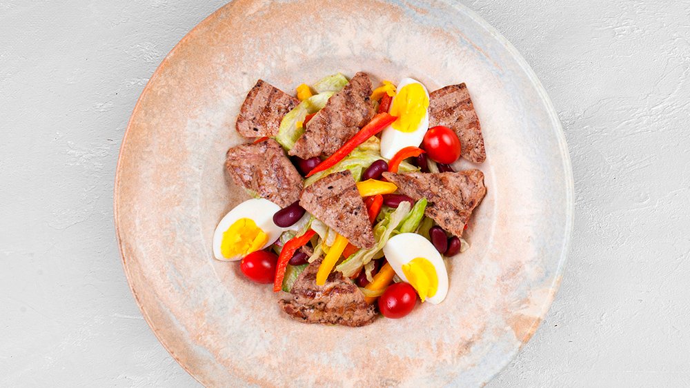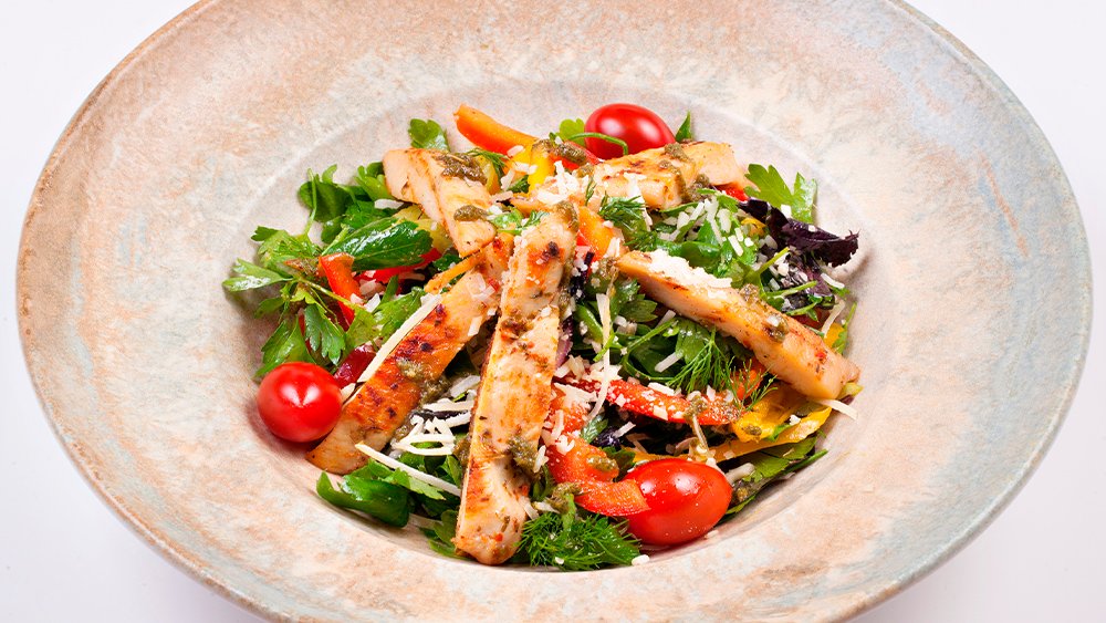 İzqara toyuq, yumurta, kök, qırmızı lobya, çerri pomidor, qarğıdalı, xiyar, çüğundur, qırmızı kələm, qara çörək otu, göyərti, xüsusi sous.
