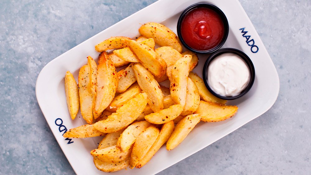 Krevet, kartof fri, panko olunmuş qabaq və kök çipsləri, xüsusi sous.