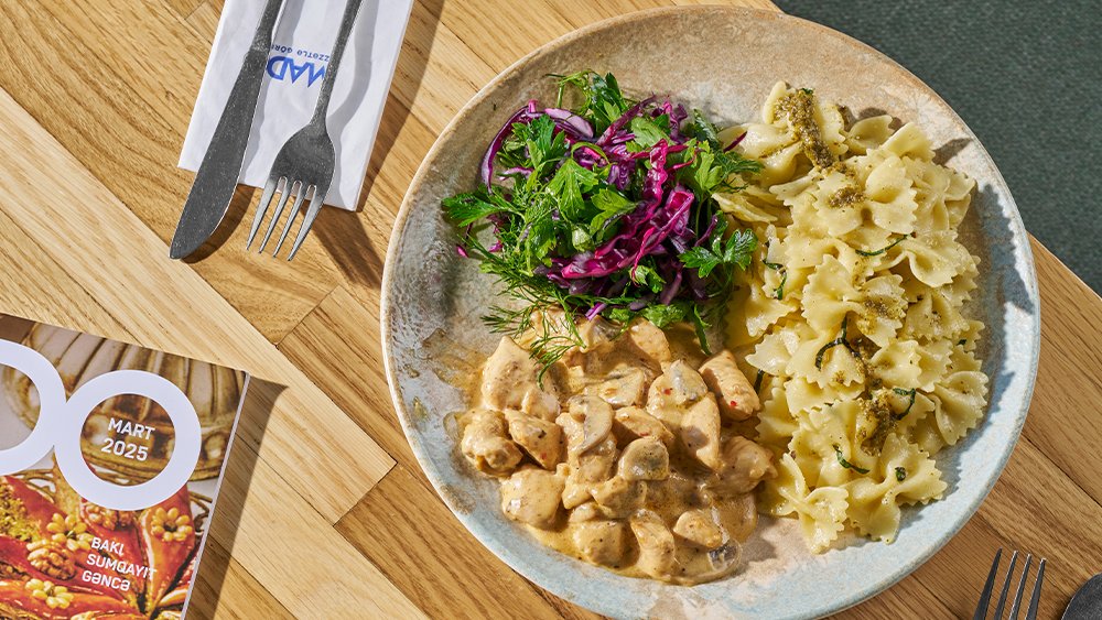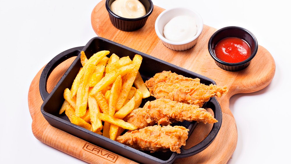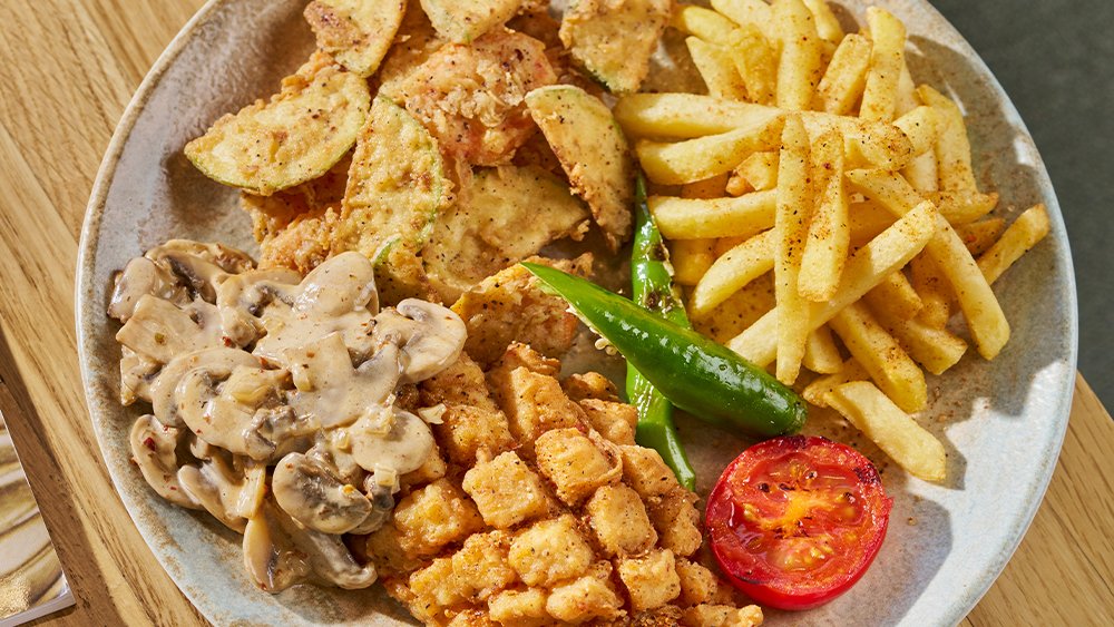 Toyuq filesi, pomidor, sivri bibər, tərəvəz sote, düyü plov, kartof fri, ballı xardal sousu, göbələk sousu, göyərti, ədviyyat.