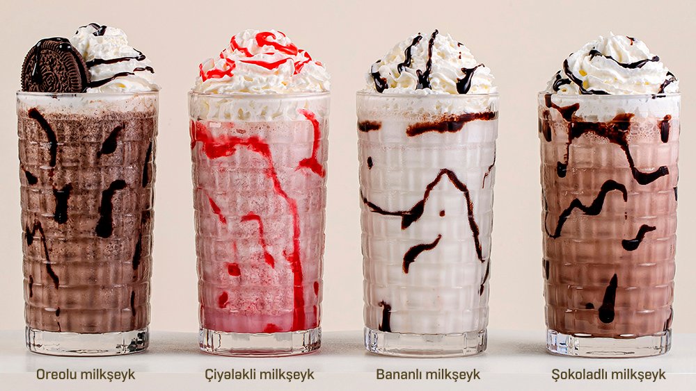 Krep xəmiri, banan, çiyələk, sadə dondurma, südlü şokolad.