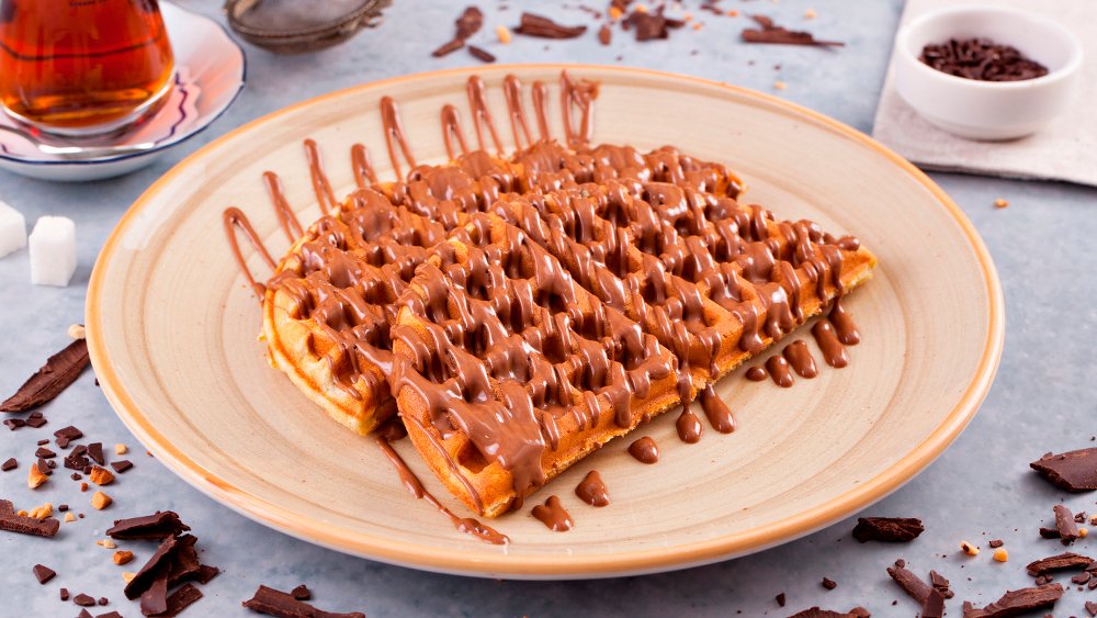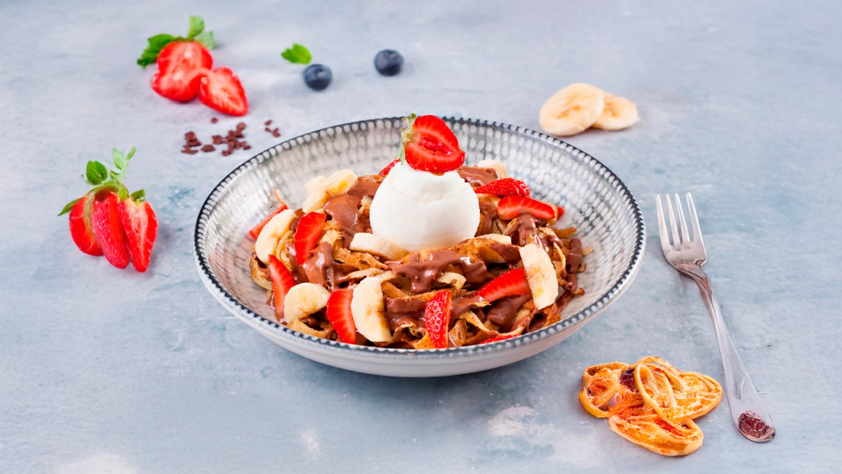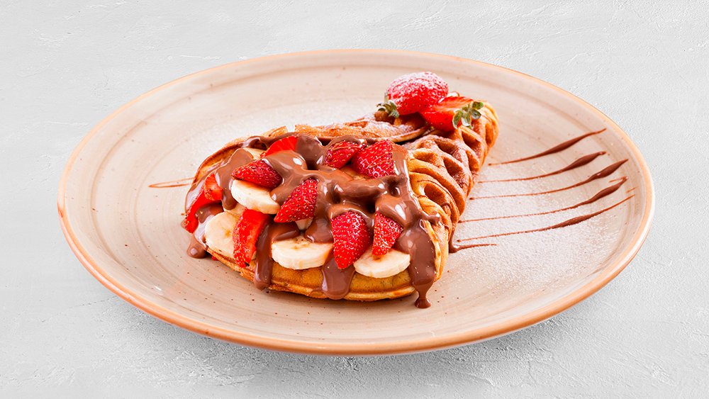 Vafl xəmiri, südlü şokolad, çiyələk, banan, şəkər kirşanı.