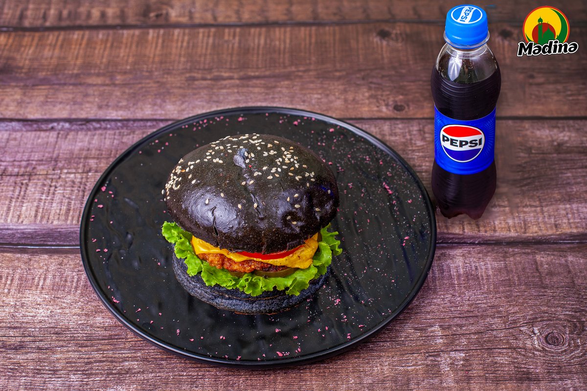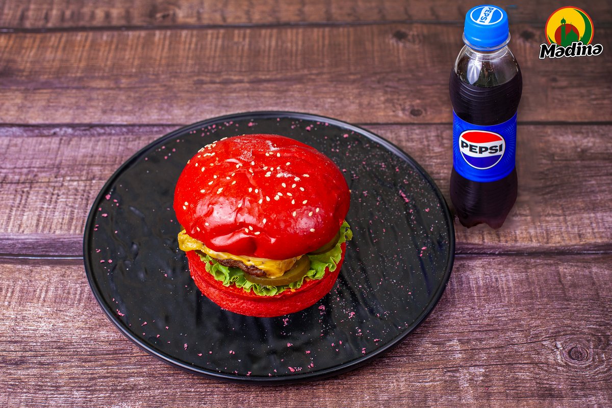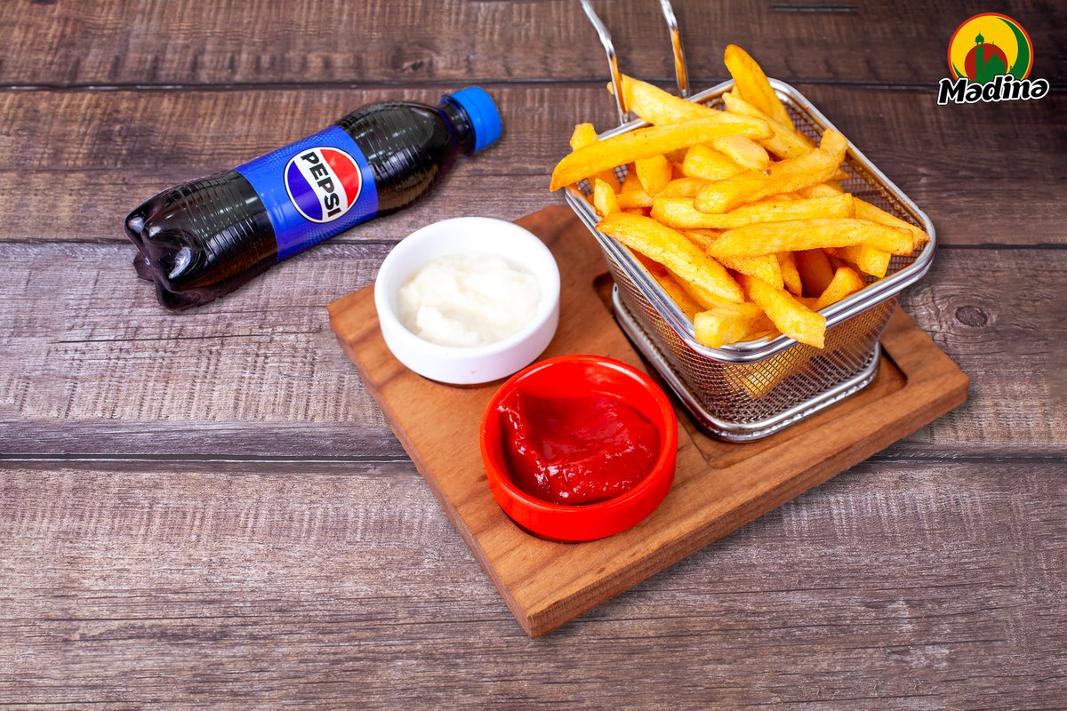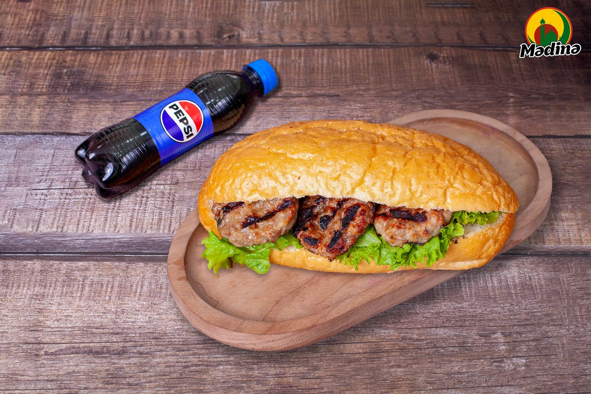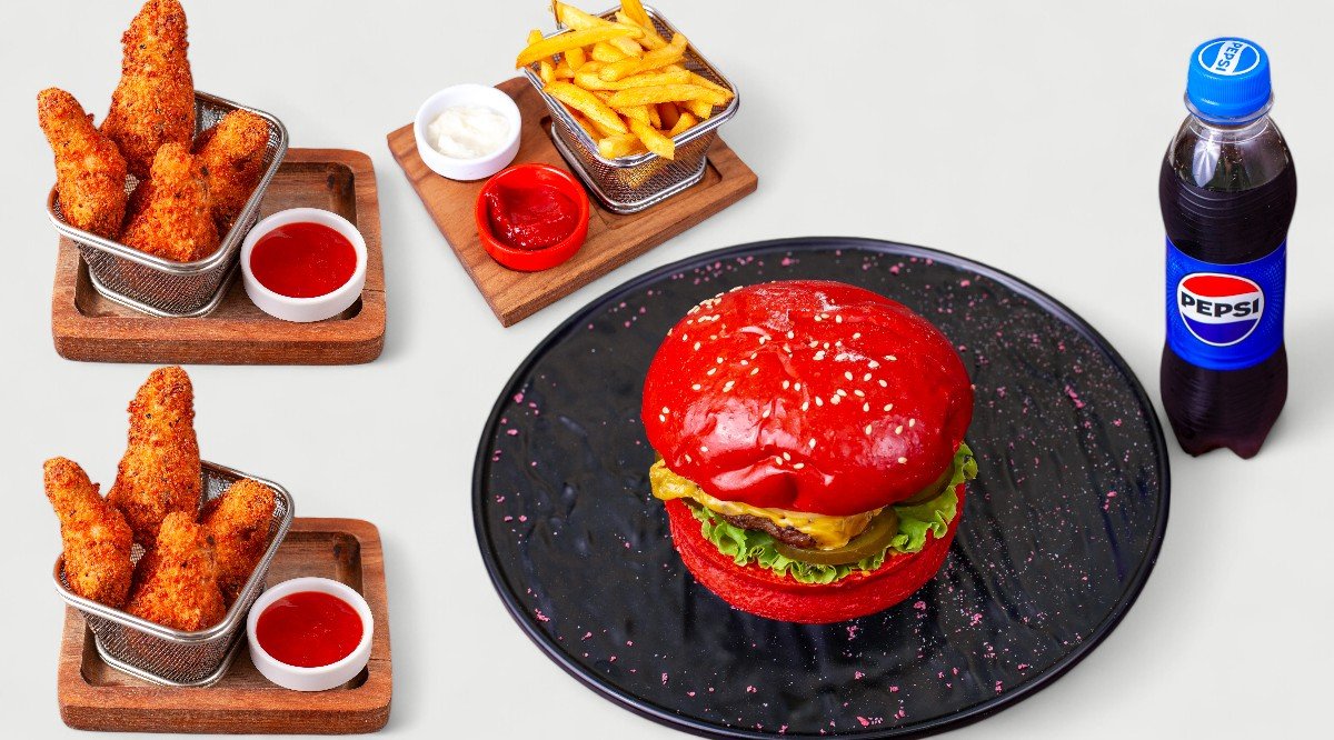 Ət burger, qızardılmış bud, qanad, kartof fri, pepsi