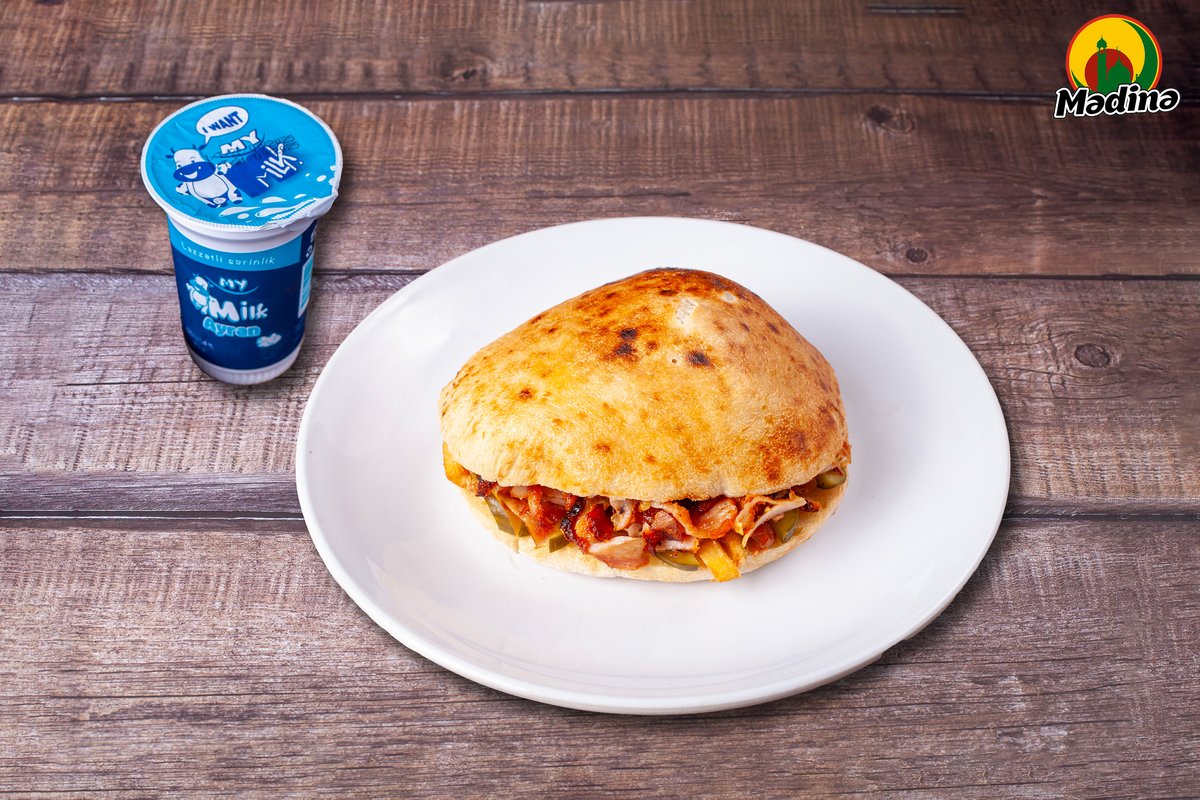 Mal əti, sarımsaqlı mayonez sousu, kartof fri, turşu xiyar, holland pendiri
