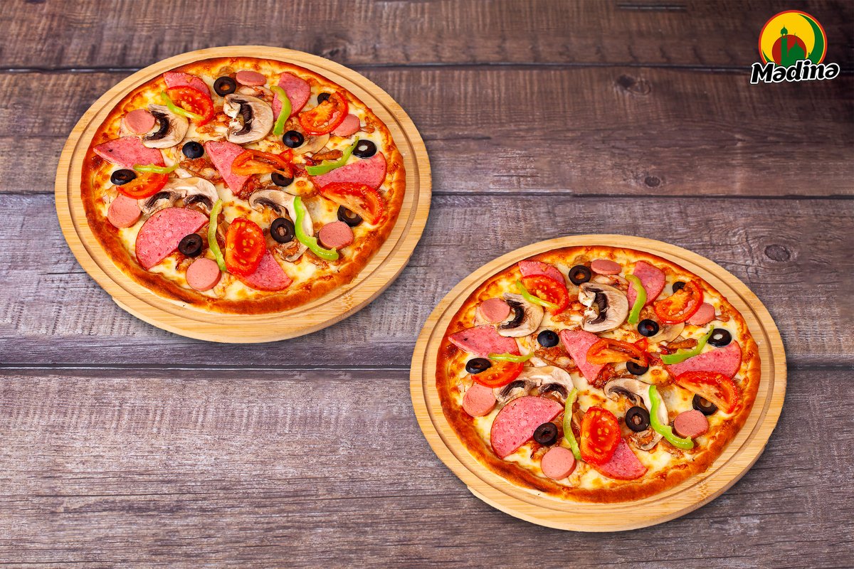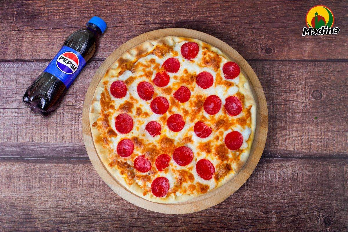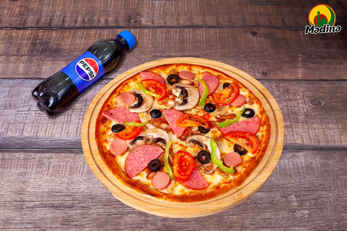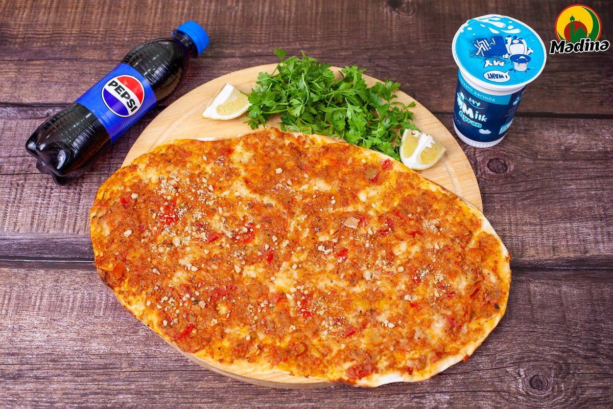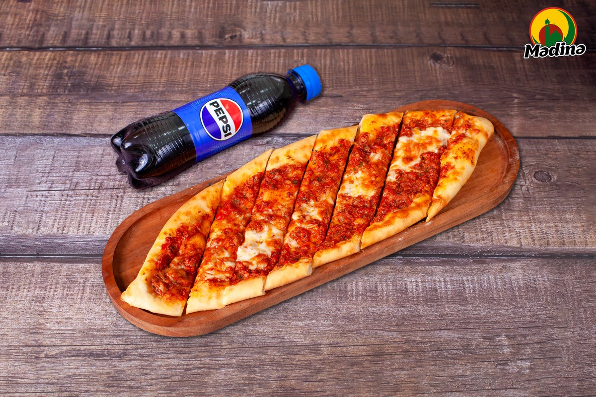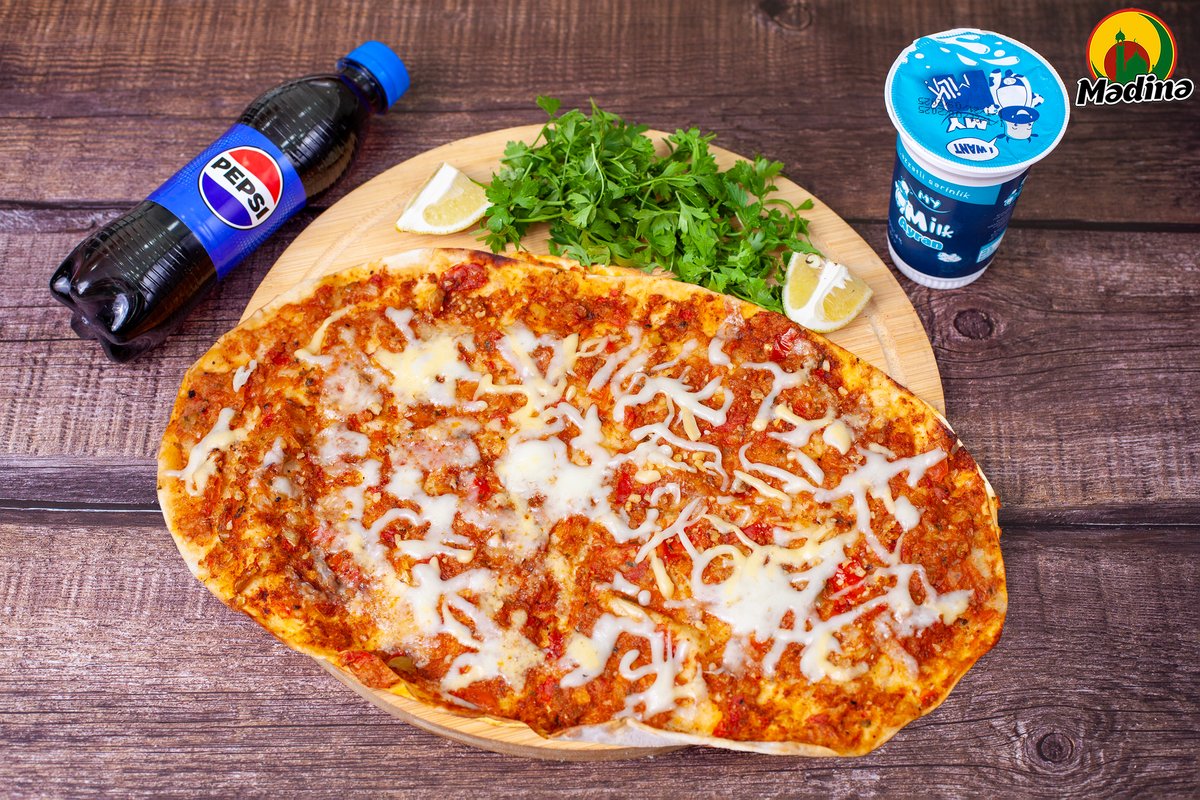 Pizza sucuq və pide qıyma və lahmacun və pepsi