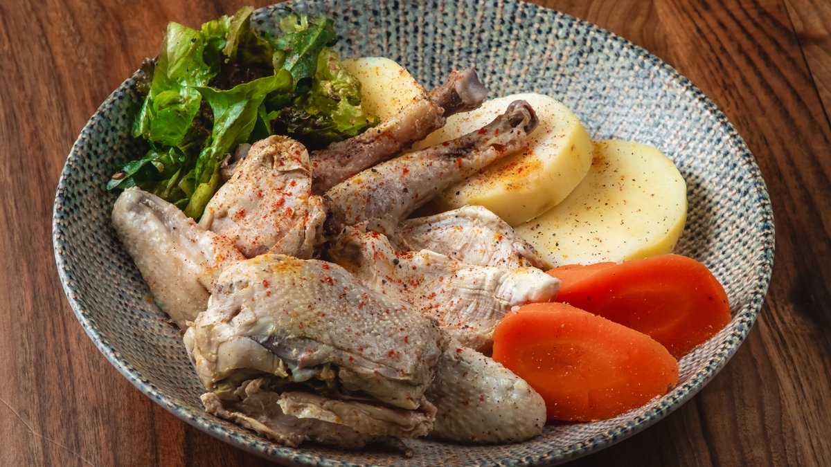 Toyuq file, kartof, yaşıl noxud, xiyar