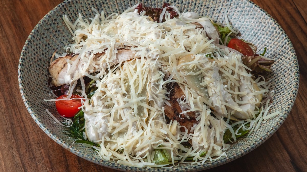 Toyuq filesi, çeri pomidor, akdeniz yaşıllıqları, vitella talata sous, parmezan, zeytun