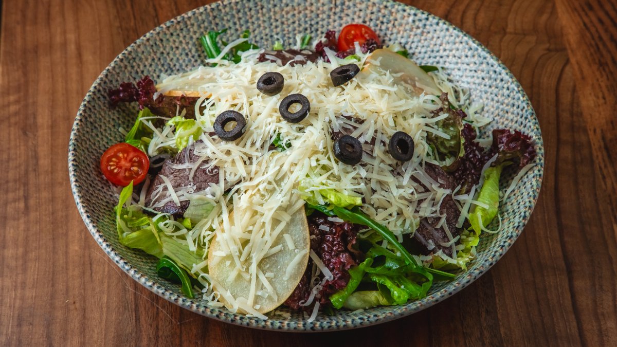 Can əti, çeri pomidor, akdeniz yaşıllıqları, vitella talata sous, parmezan, zeytun
