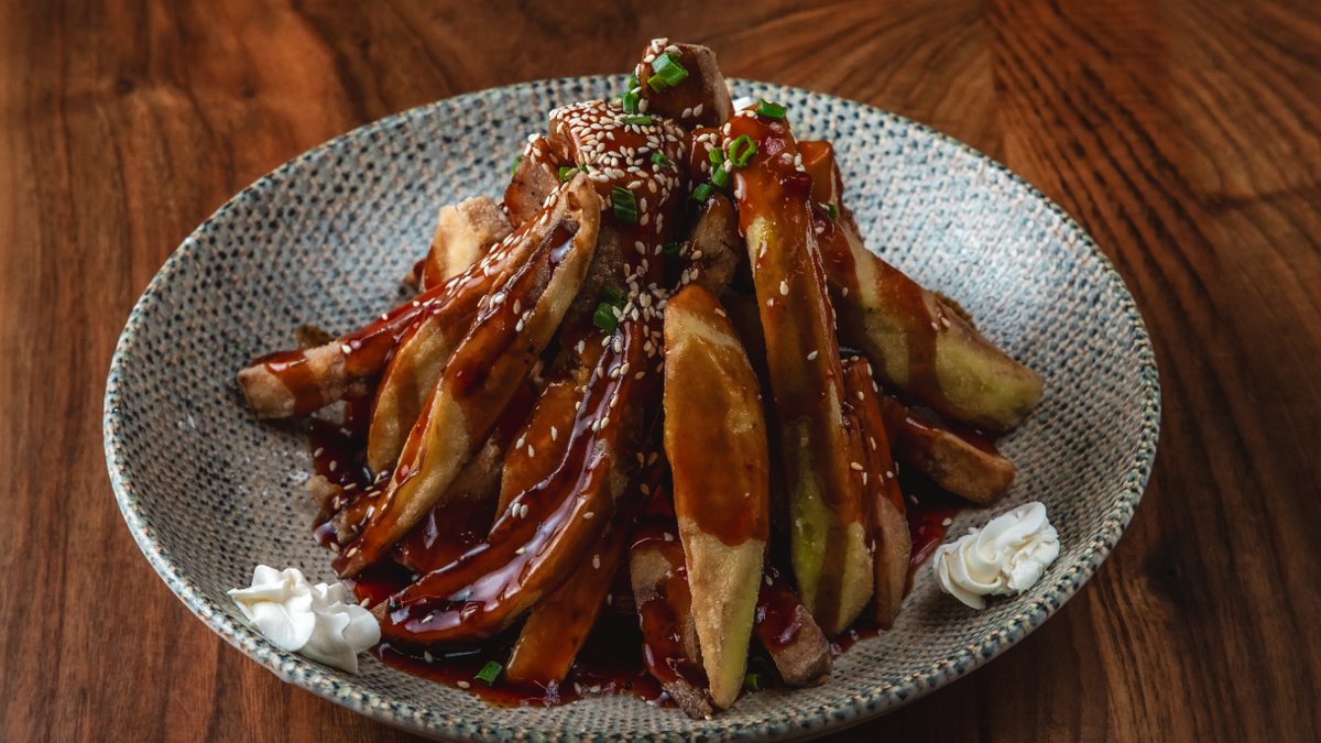 Badımcan, pomidor, krem pendir, küncüt, asiya sous