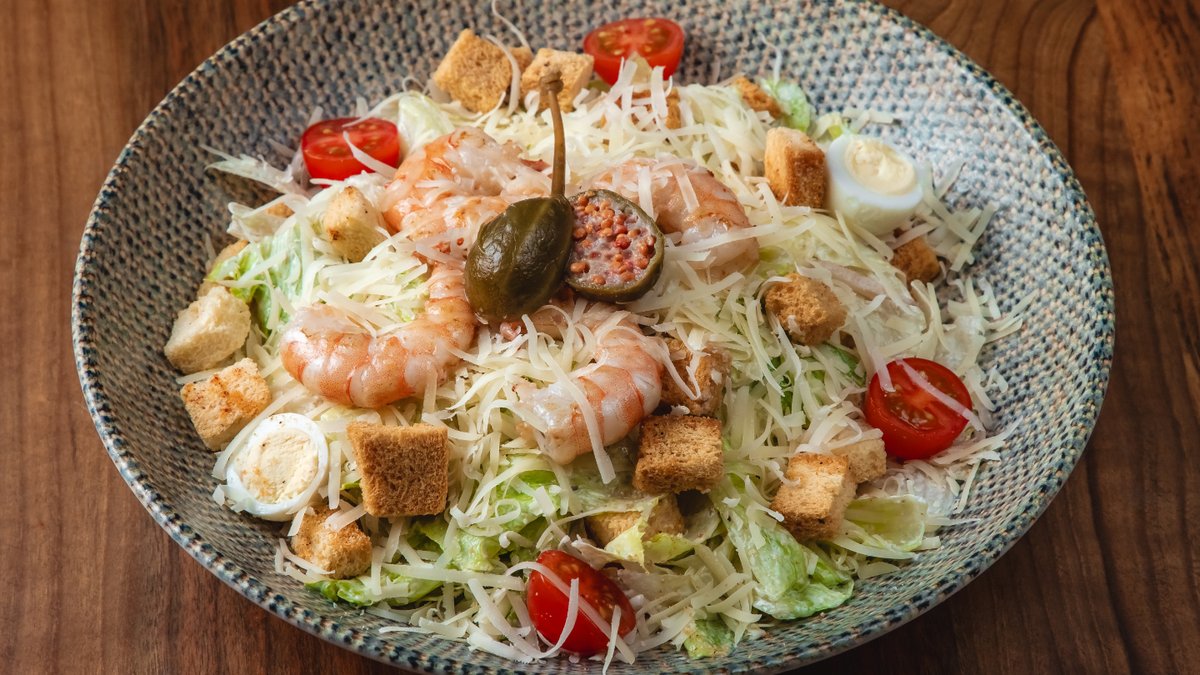 Sezar sous, aysberq, okean krvetkası, suxarı, parmezan, bildirçin yumurtası