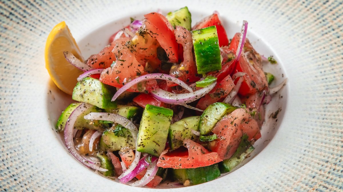 Badımcan, pomidor. Rəngli bibər, qırmızı soğan, zeytun yağı, limon