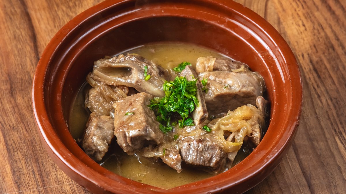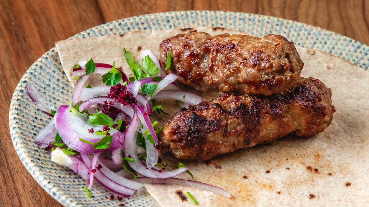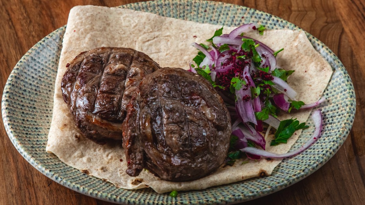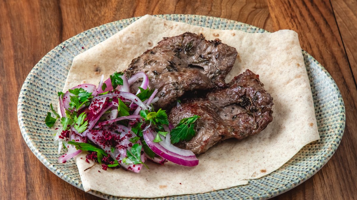 Dana qabırğası, qırmızı soğan, lavaş, sumax, bağ göyərtiləri
