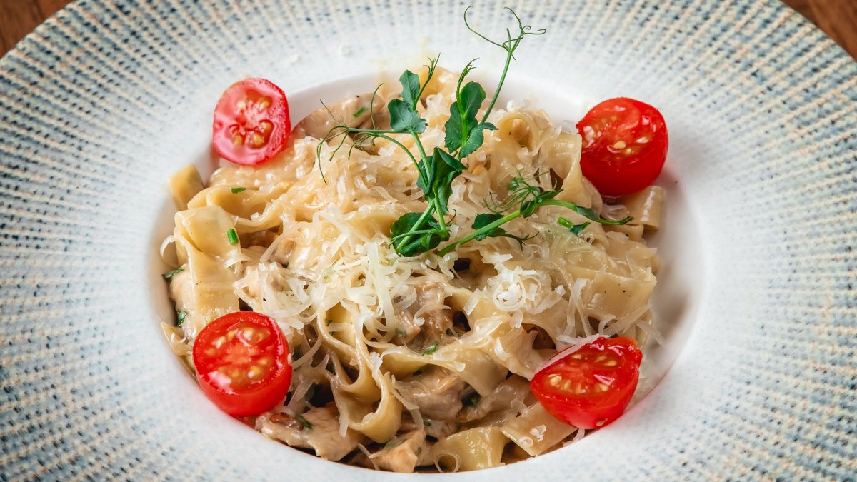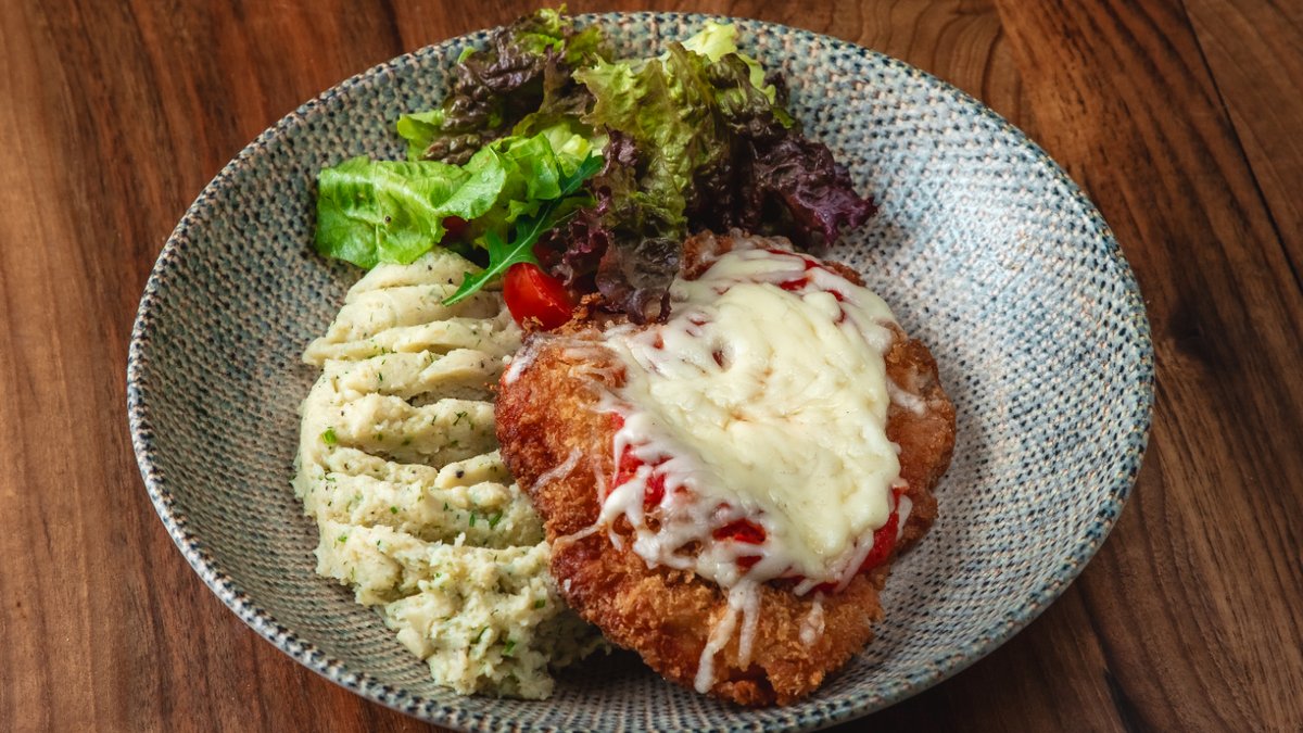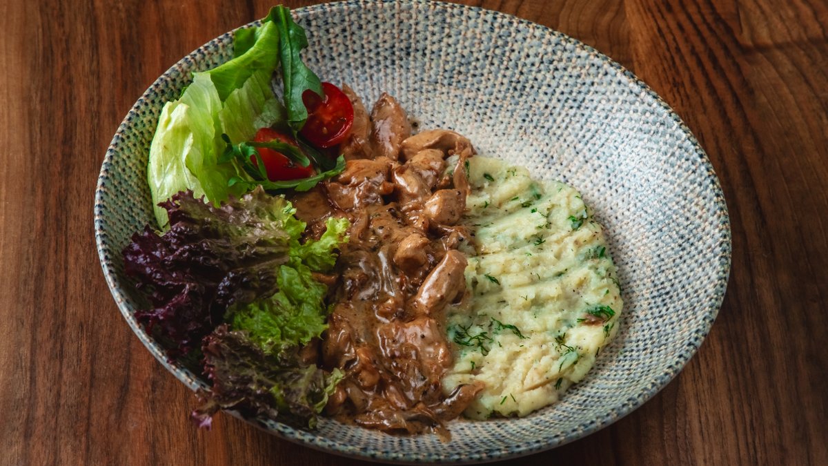 Toyuq filesi, mozerrella pendiri, göbələk, qaymaq
