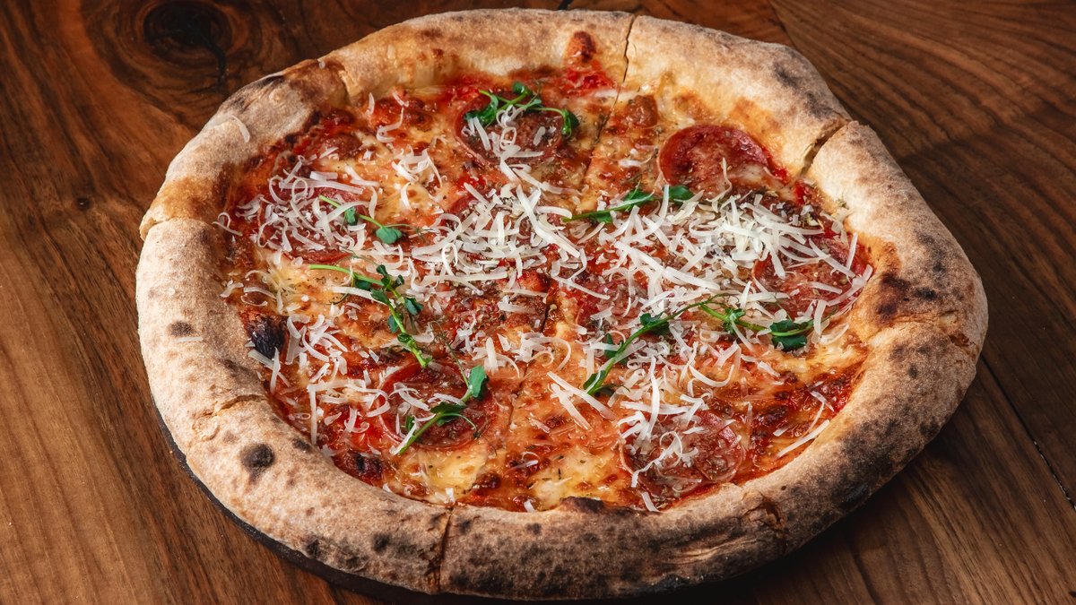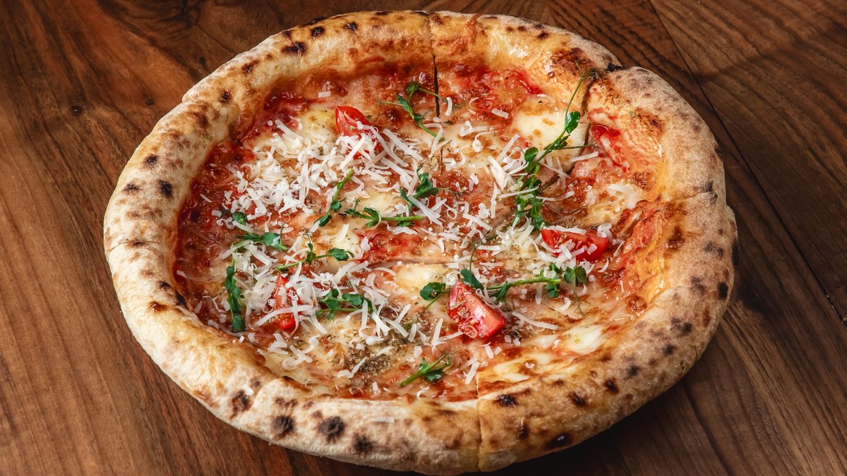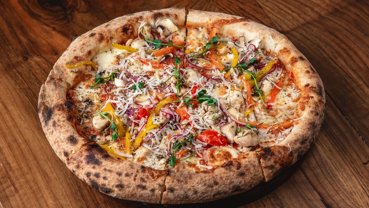 Okean krvetkası, pomidor, acı bibər, soğan, rəngli bibər, mozerella pendiri