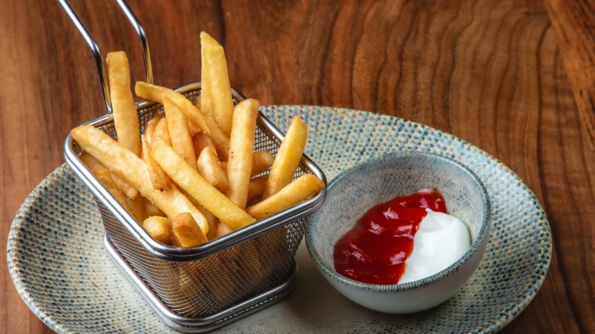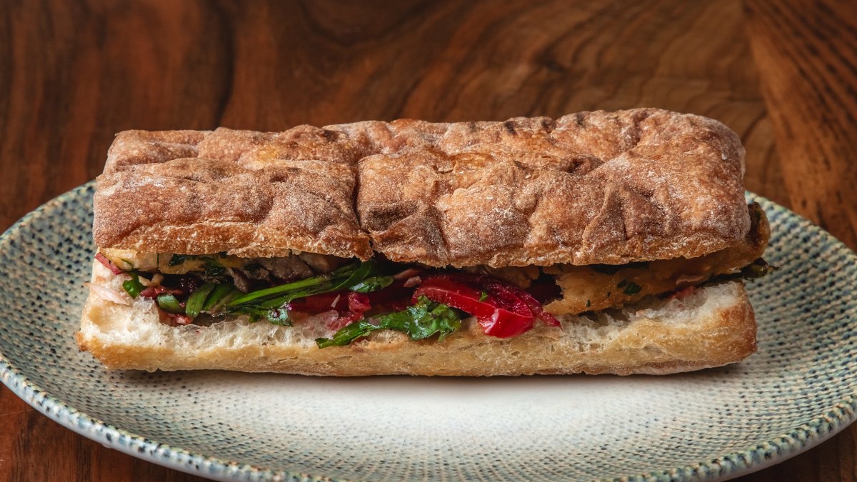 Ciabatta çörəyi, qızılbalıq h\v, qırmızı soğan, krem pendir, akdeniz yaşıllıqı kartof fri