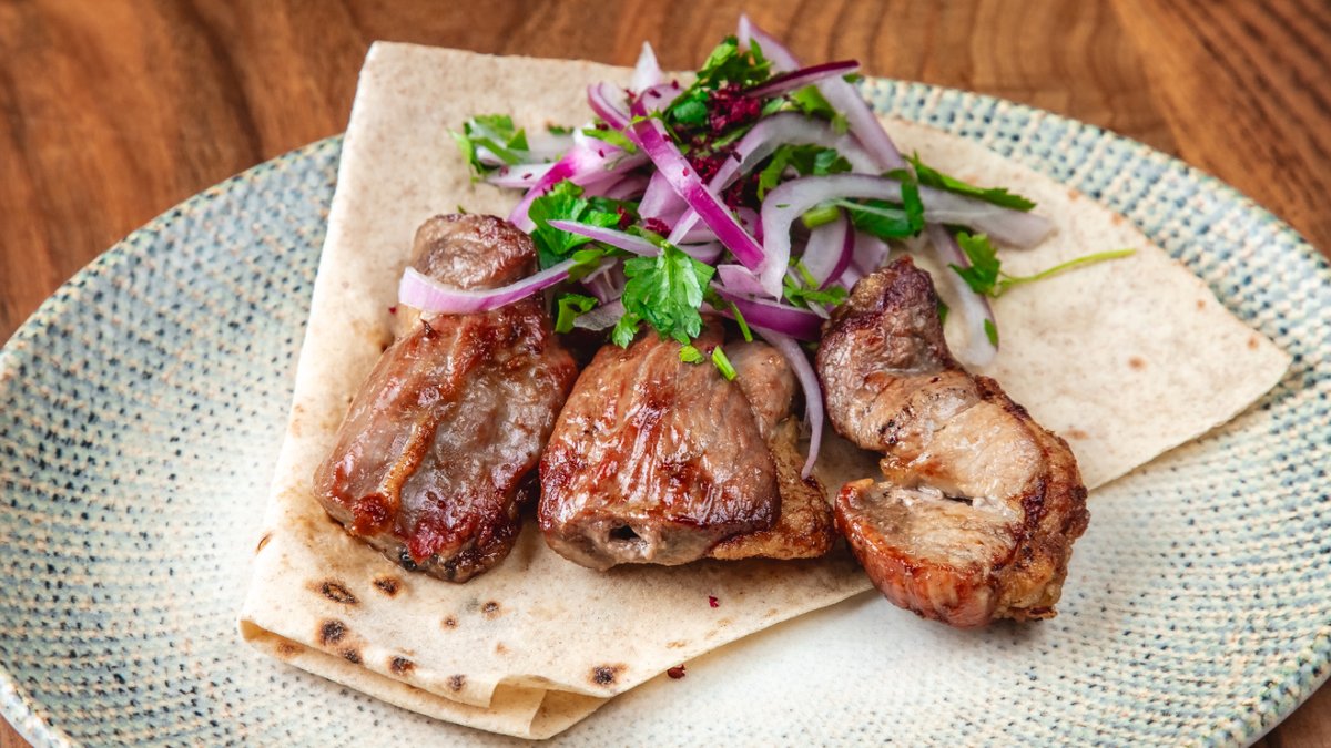 Quzu bel əti, qırmızı soğan, bağ göyərtiləri, sumax, lavaş