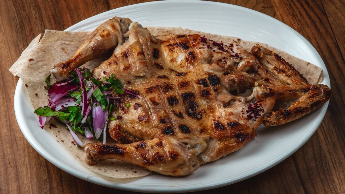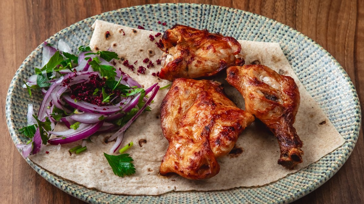 Toyuq broyler, qırmızı soğan, bağ göyərtiləri, sumax, lavaş