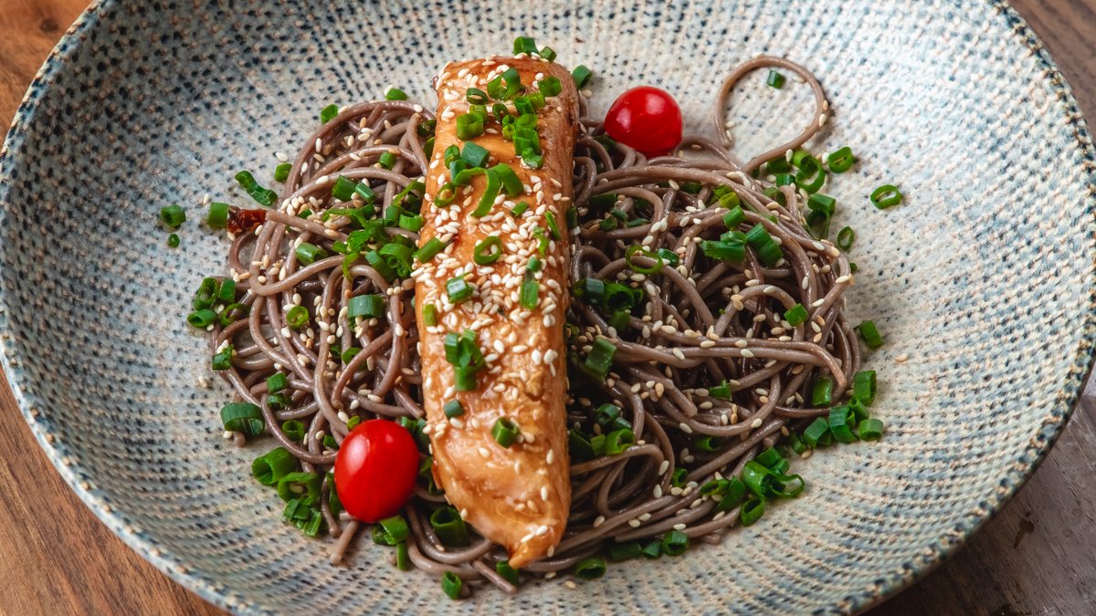 Norveç qızılbalıq, teryaki sous, qaymaq, fettucine pasta