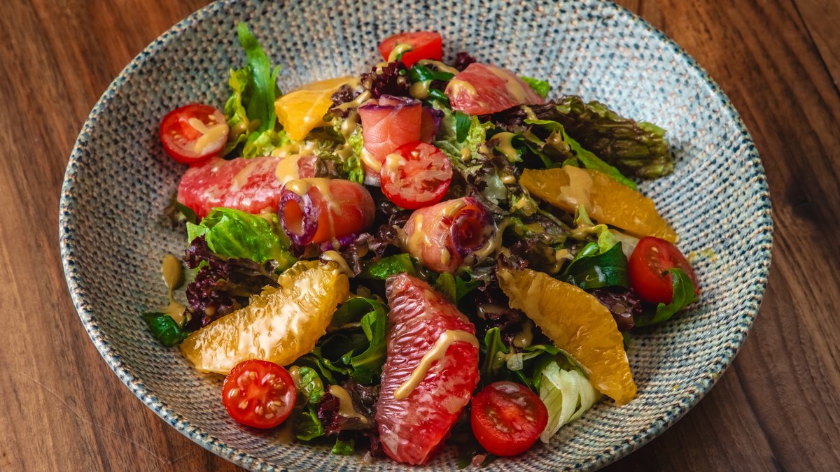 Asatrin balıqı, bağ göyərtiləri, pomidor