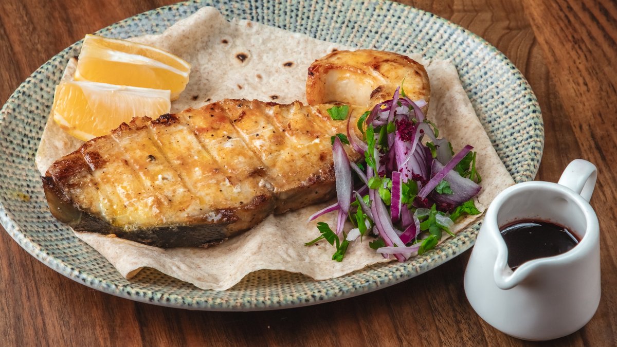 Dorado, narşərab, limon, qırımız soğan, bağ göyərtiləri, sumax, lavaş