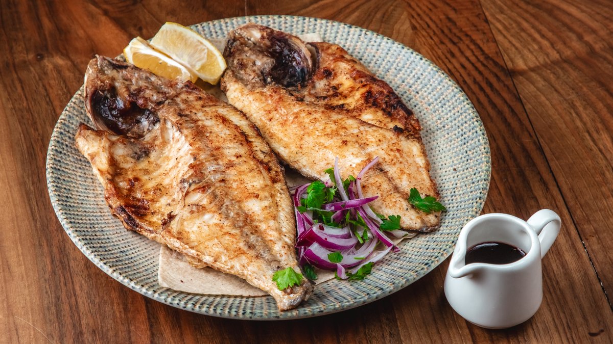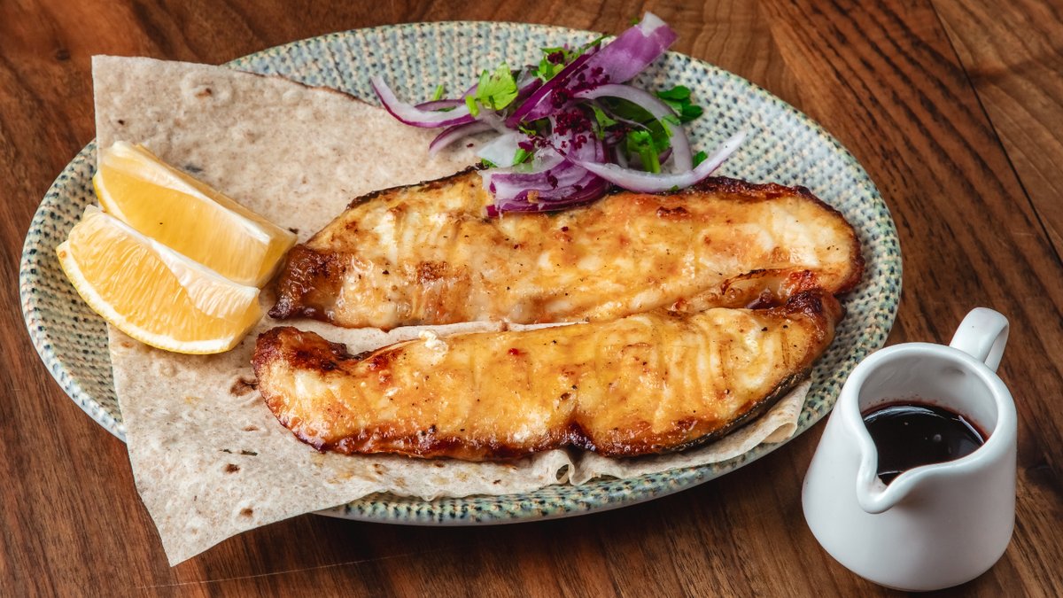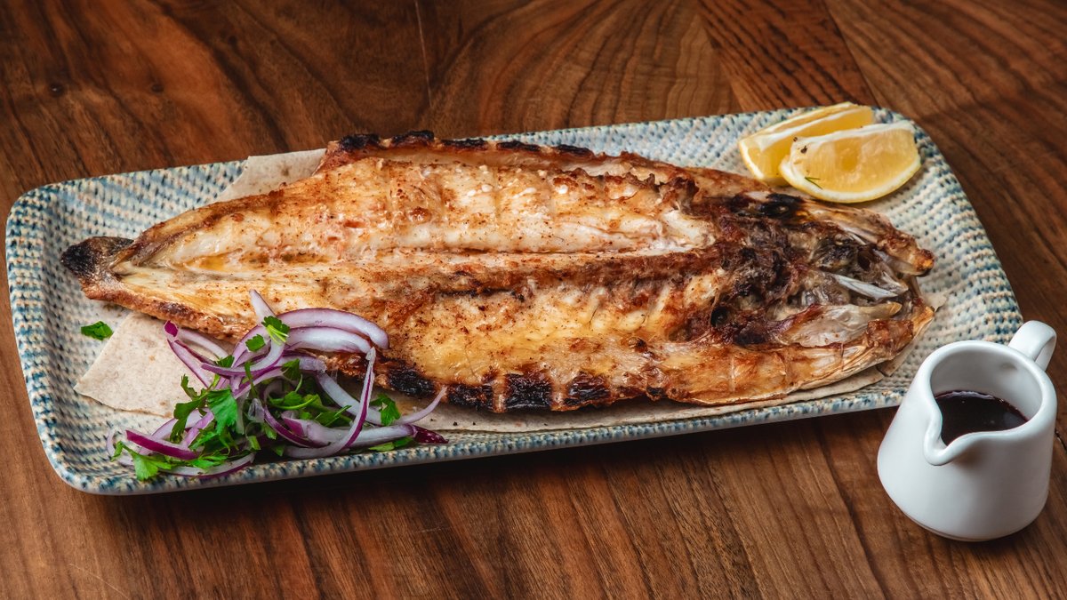 Levrek, narşərab, limon, qırımız soğan, bağ göyərtiləri, sumax, lavaş