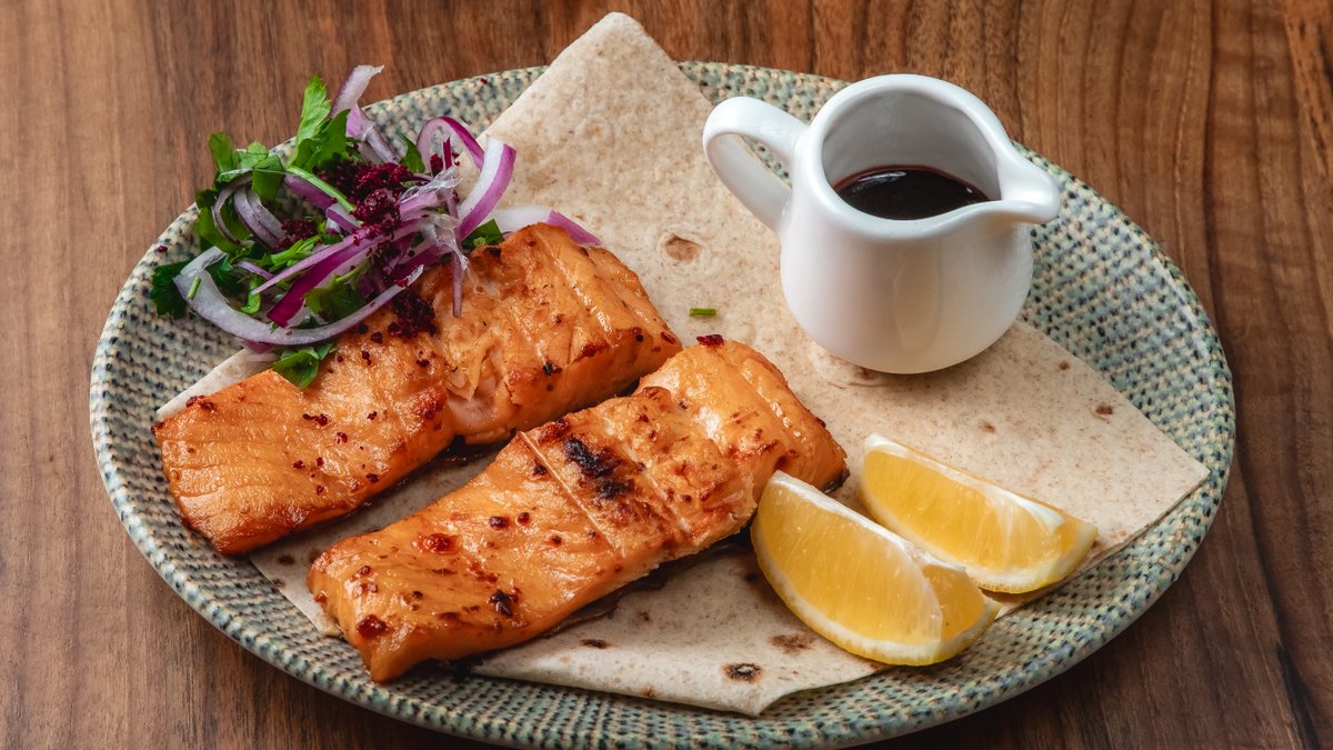 Norveç qızılbalıqı, qırmızı soğan, lavaş, sumax