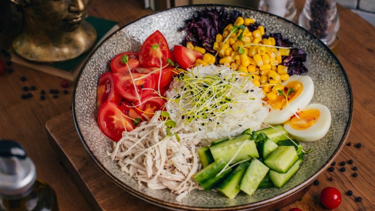 Düyü, yumurta, xiyar, qaynadılmış toyuq, zire pomidor, qarğıdalı