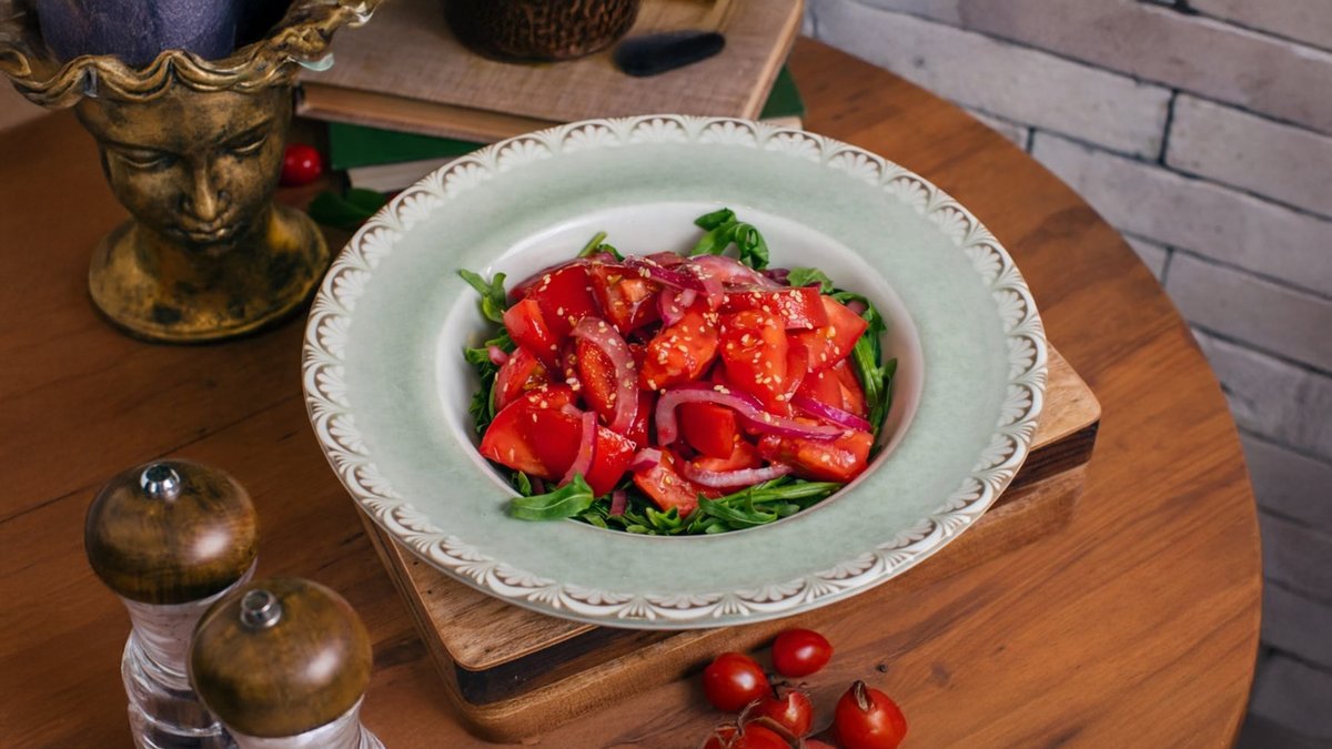 Qazax pomidoru, əzmə zoğal turşusu, qırmızı soğan, rukkola