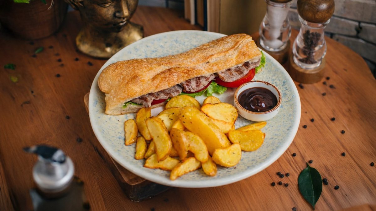 Grildə hazırlanmış dana əti , pomidor , turşu xiyar , özəl sous , ev sayağı kartof