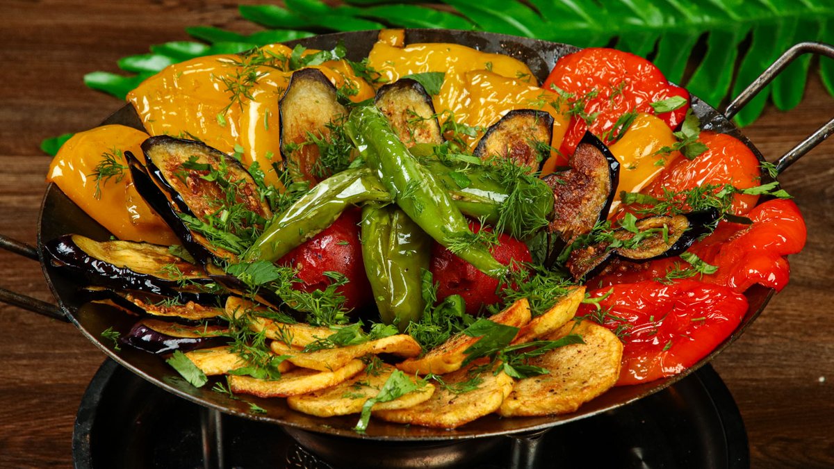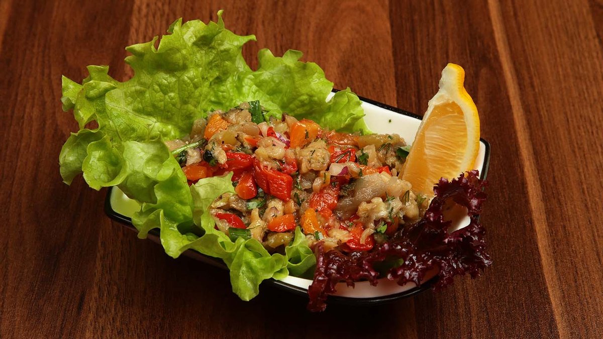 Közlənmiş tərəvəzlər, qırmızı soğan, göyərti, limon suyu, zeytun yağı