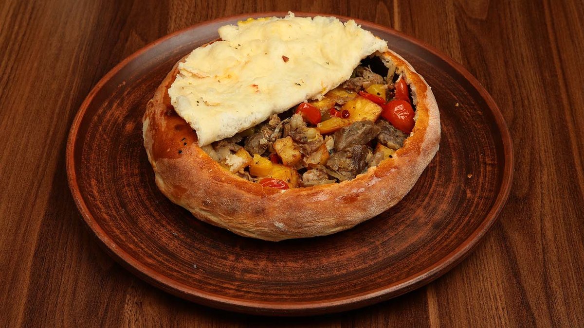 Özəl xəmir, özəl sous, dana əti qiymə, pomidor, zeytun, bibər, mozzarella pendiri