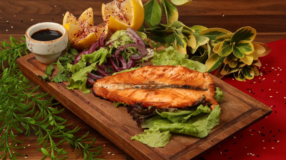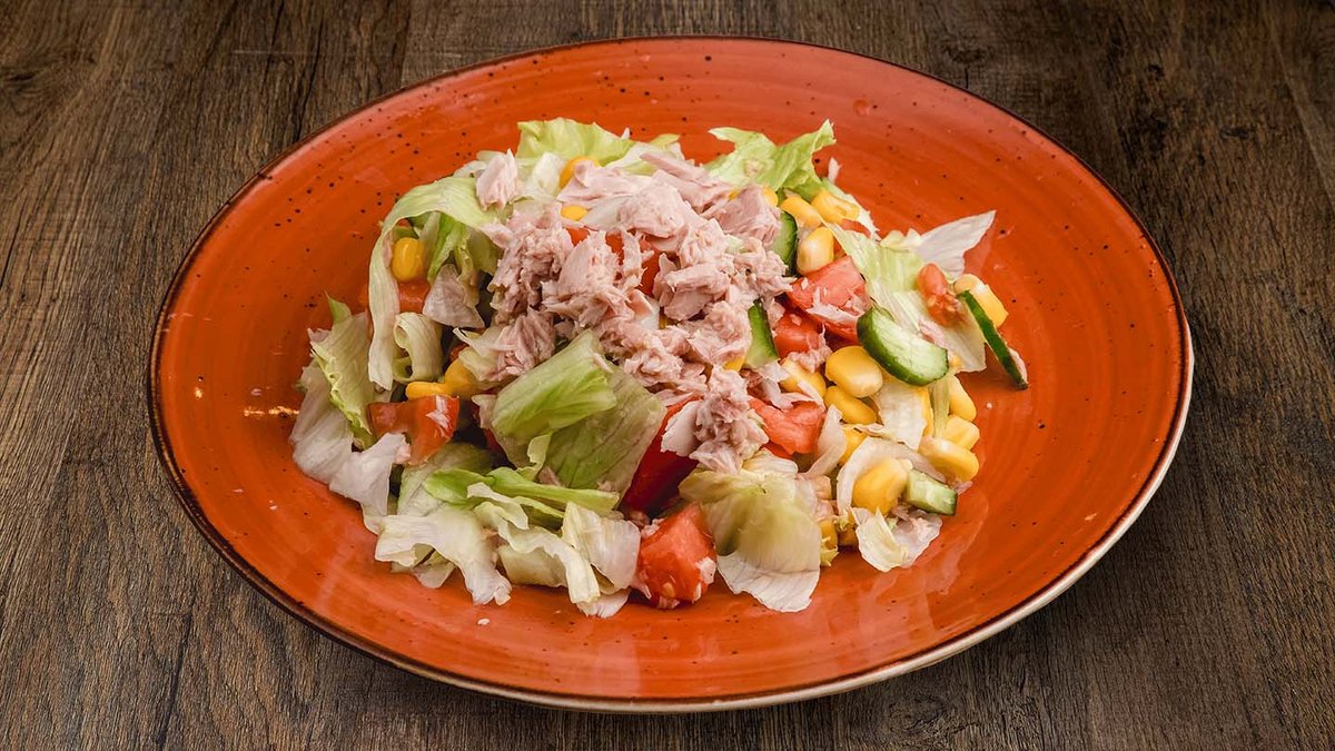 Ton balığı, qarışıq göyərtilər, qarğıdalı,qaynadılmış yumurta,hövsan soğanı, özəl sous