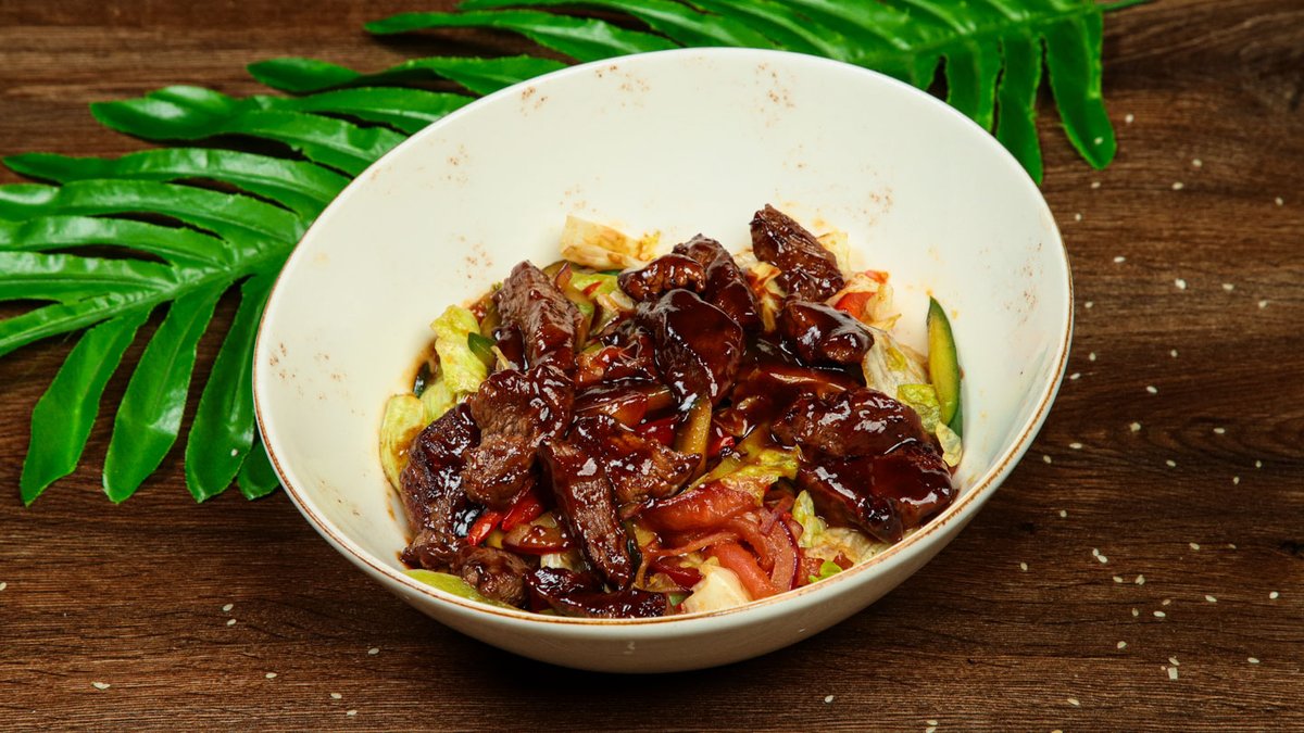 Qarışıq tərəvəz və göyərtilər, dana can əti, ağ pendir, özəl sous