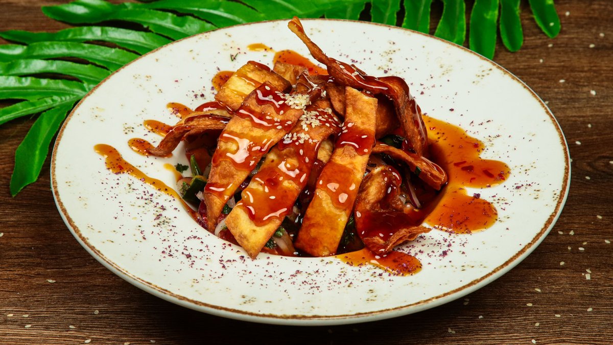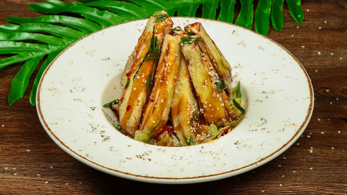 Xırçıltılı badımcan, qarışıq göyərtilər, pomidor, özəl sous