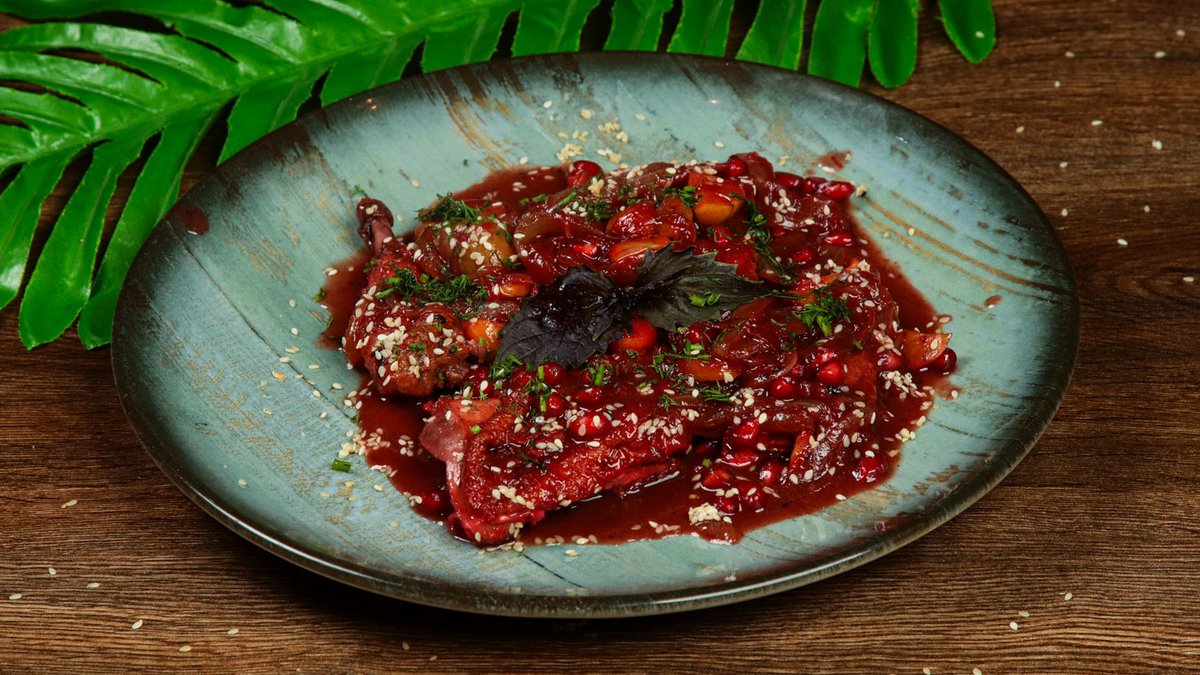 Toyuq filesi, qızardılmış tərəvəzlər, zoğal əzməsi