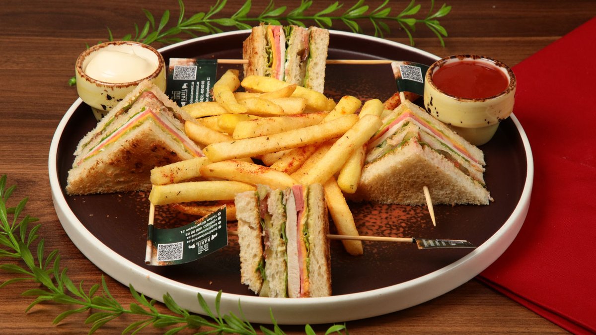 Tost çörək, toyuq filesi, özəl sous, iceberq kahısı, dana vetçina, yumurta, xiyar, pomidor, turşu xiyar, holland pendiri, ketçup, mayonez, kartof fri
