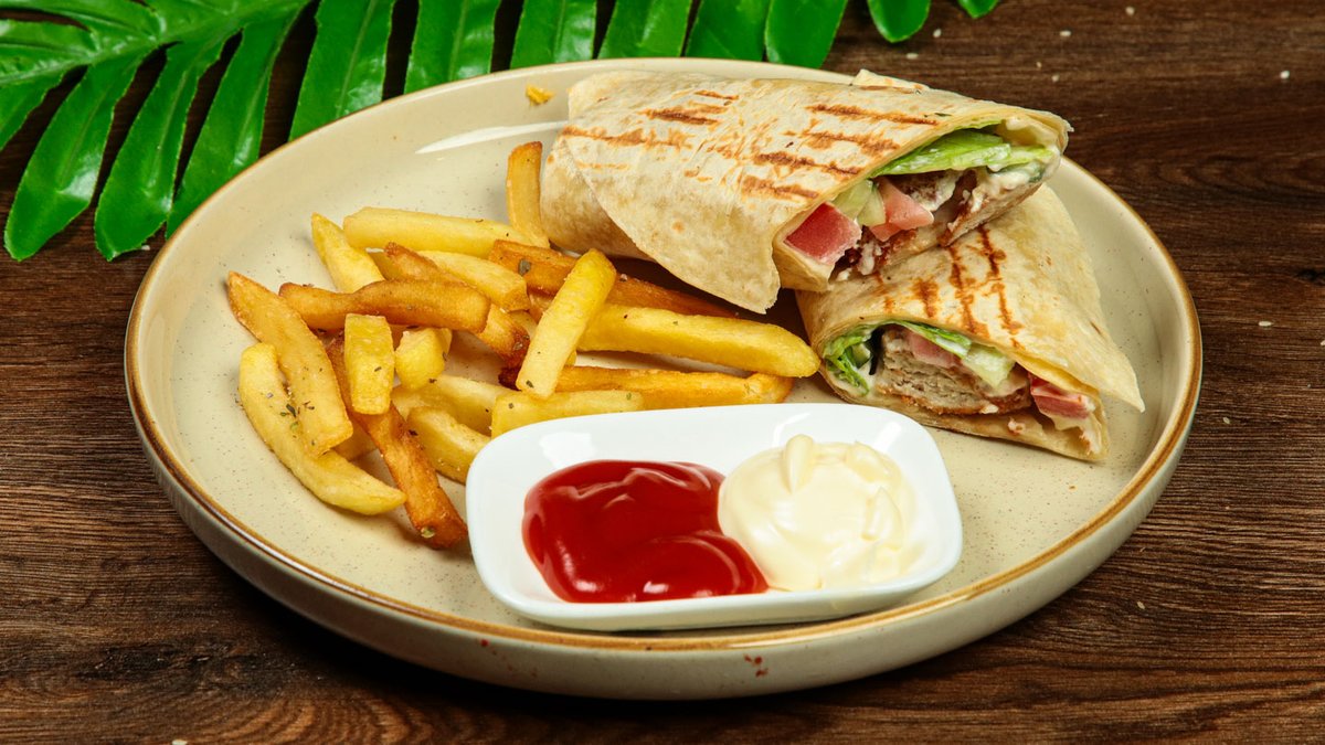 Tortilla, toyuq filesi, özəl sous, iceberq kahısı, pomidor, parmezan pendiri, ev sayağı kartof